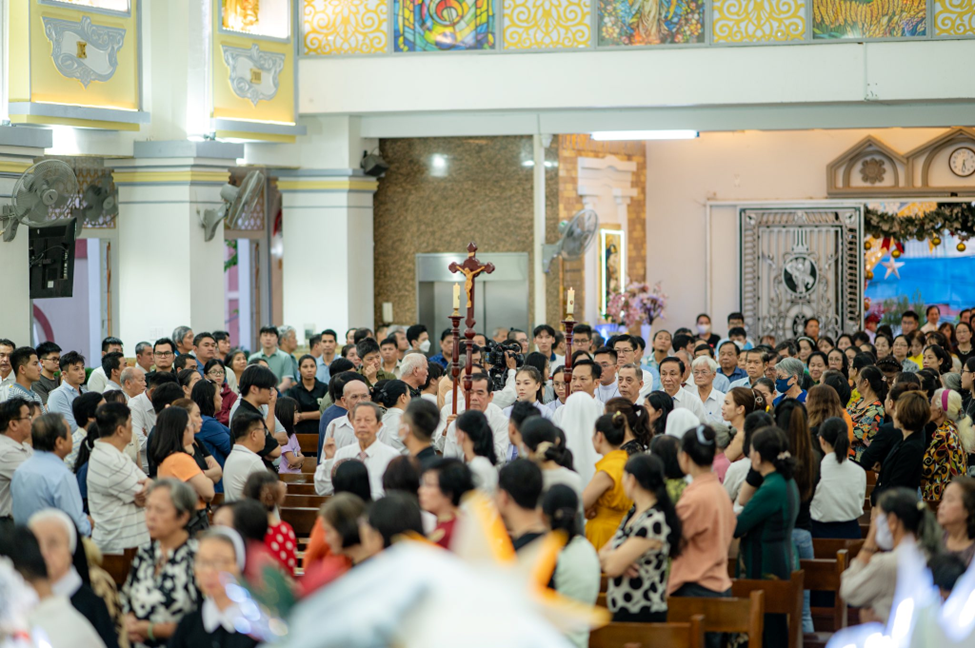 Thánh lễ khởi sự với đoàn rước từ cuối nhà thờ tiến lên cung thánh.