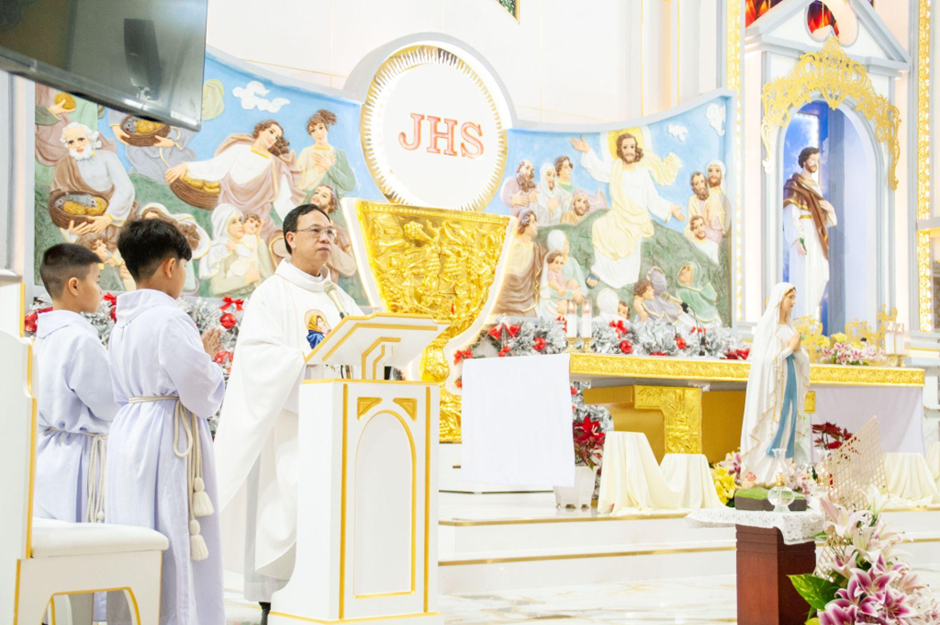 Mở đầu Thánh lễ, cha chánh xứ gửi lời chúc mừng bổn mạng đến toàn thể giáo khu.