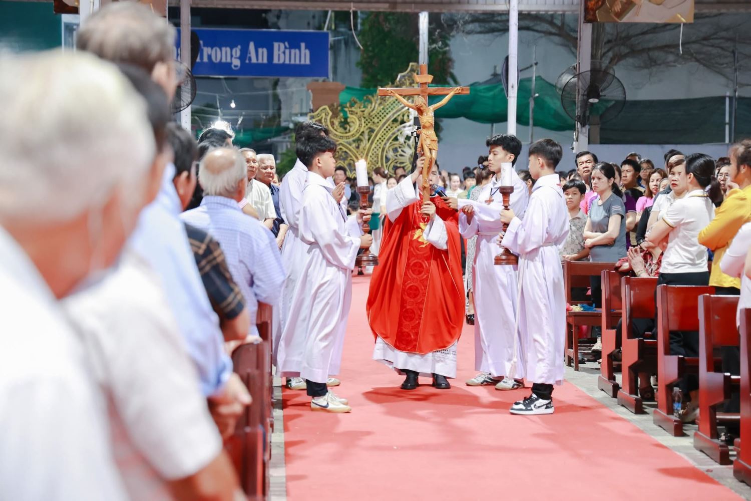 Thánh giá được rước từ cuối nhà thờ tiến lên cung thánh trong bầu khí trang nghiêm, với ba lần dừng lại để cộng đoàn thờ lạy. Khi Thánh giá được giương cao, mọi người cùng quỳ gối tôn kính, tưởng nhớ tình yêu cứu độ của Chúa.