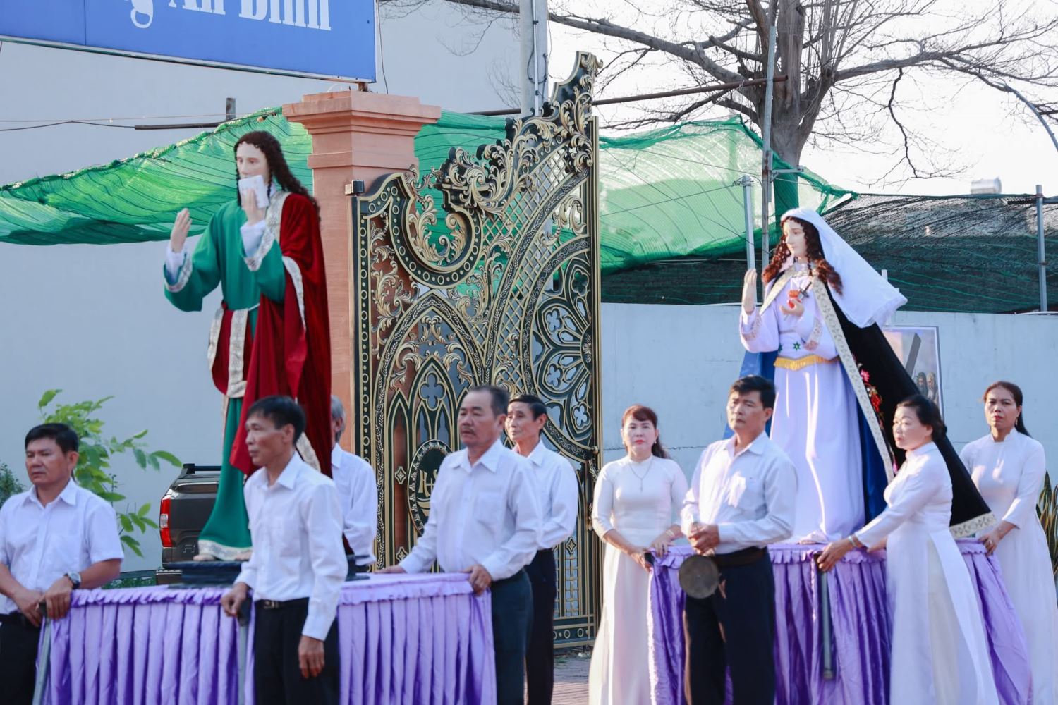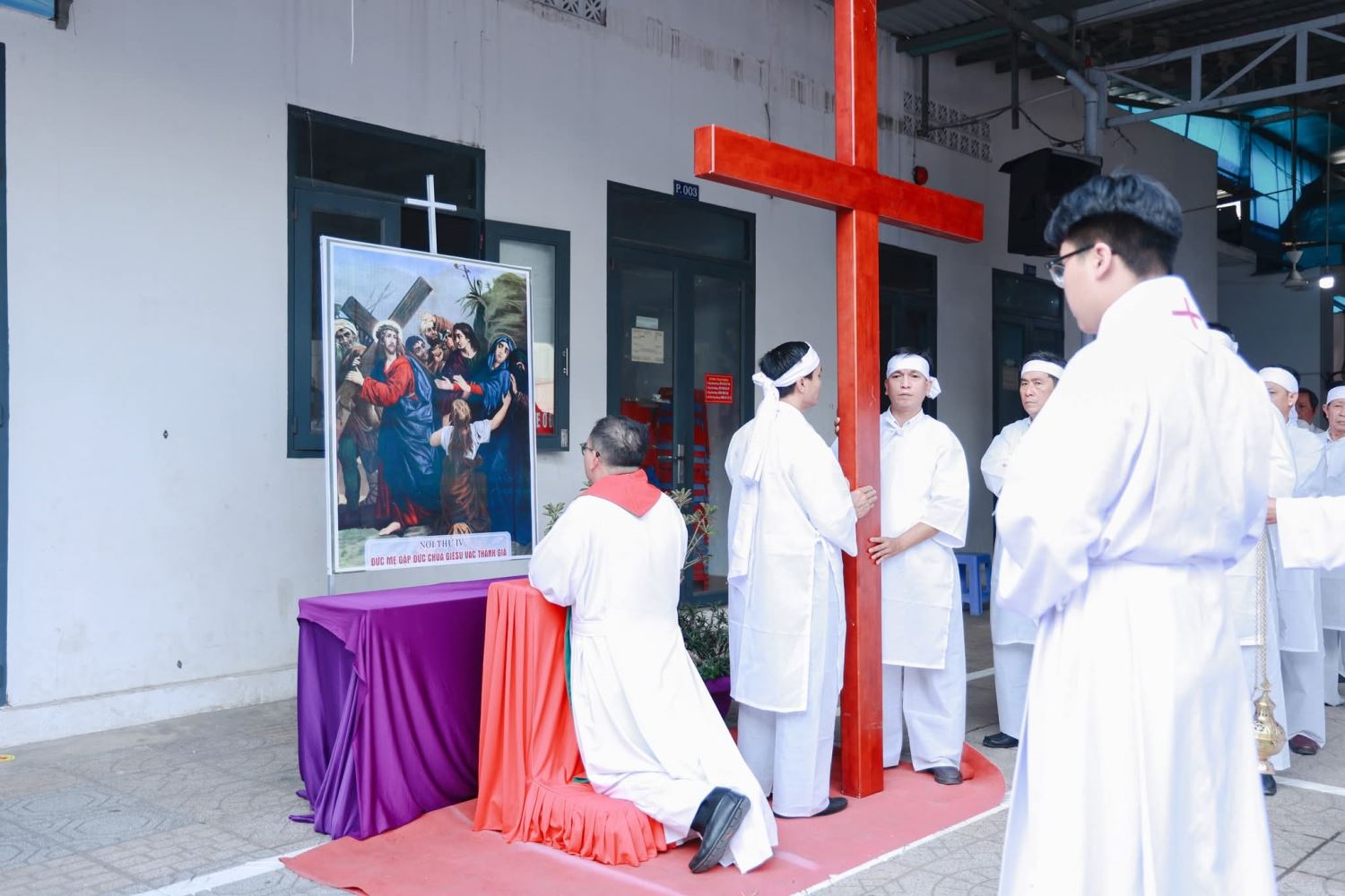 Từ 16g30, cộng đoàn đã quy tụ đông đủ tại khuôn viên nhà thờ để tham dự việc đi Đàng Thánh Giá. Mọi người cùng bước theo Chúa Giêsu trên con đường khổ nạn, suy niệm cuộc thương khó từ khi Người bị kết án cho đến khi chịu chết và được mai táng.