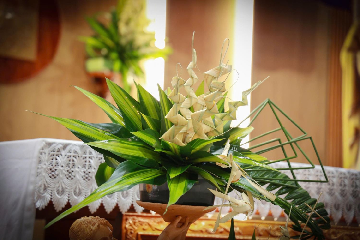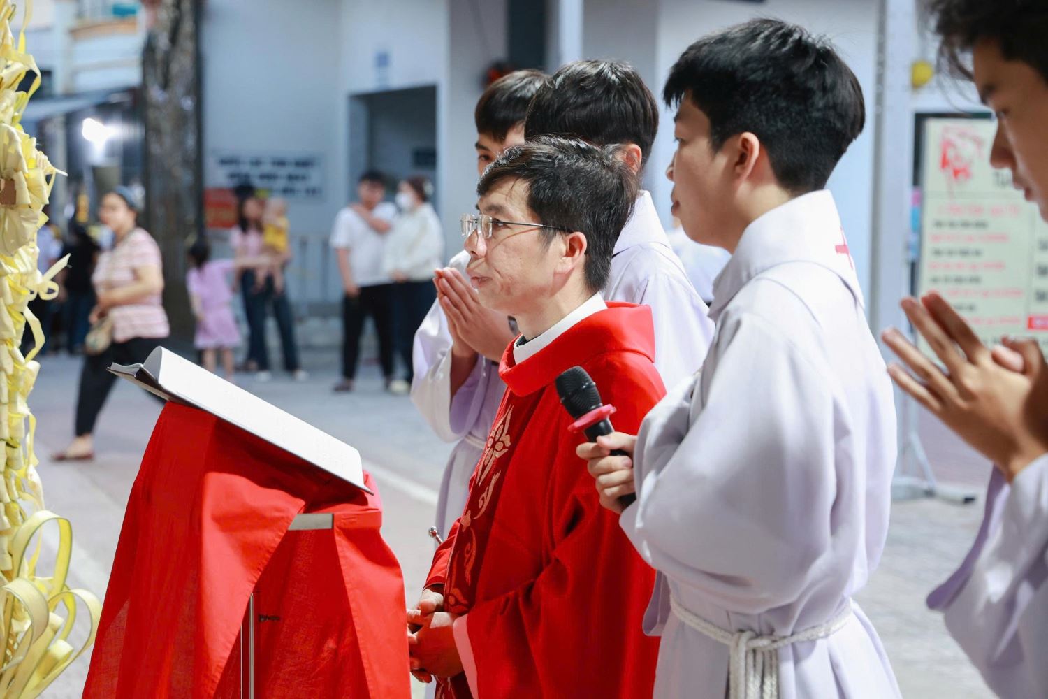 Trước Thánh lễ, linh mục Giuse cùng cộng đoàn cử hành nghi thức làm phép lá tại khuôn viên nhà thờ. Sau đó, trong bầu khí trang nghiêm và sốt sắng, đoàn rước tiến vào thánh đường với những cành lá trên tay, hòa cùng ca nhập lễ, tưởng niệm biến cố Chúa Giêsu khải hoàn vào thành Giêrusalem.