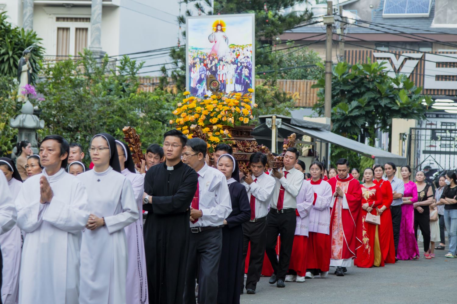 Thánh lễ được mở đầu bằng đoàn rước kiệu Thánh tích Các Thánh Tử Đạo Việt Nam quanh khuôn viên giáo xứ và tiến vào thánh đường trong tiếng kèn đồng và lời kinh sốt sắng.