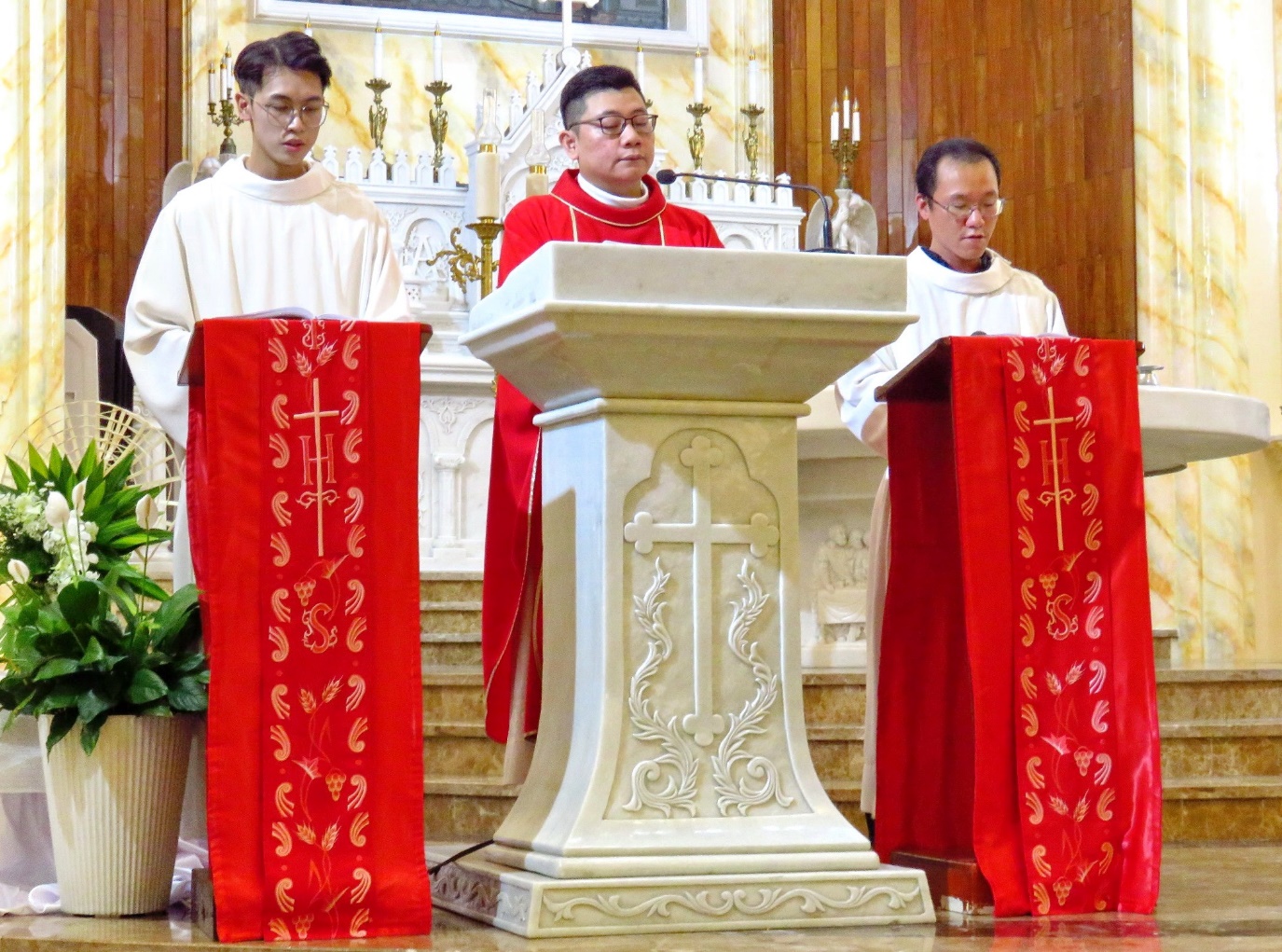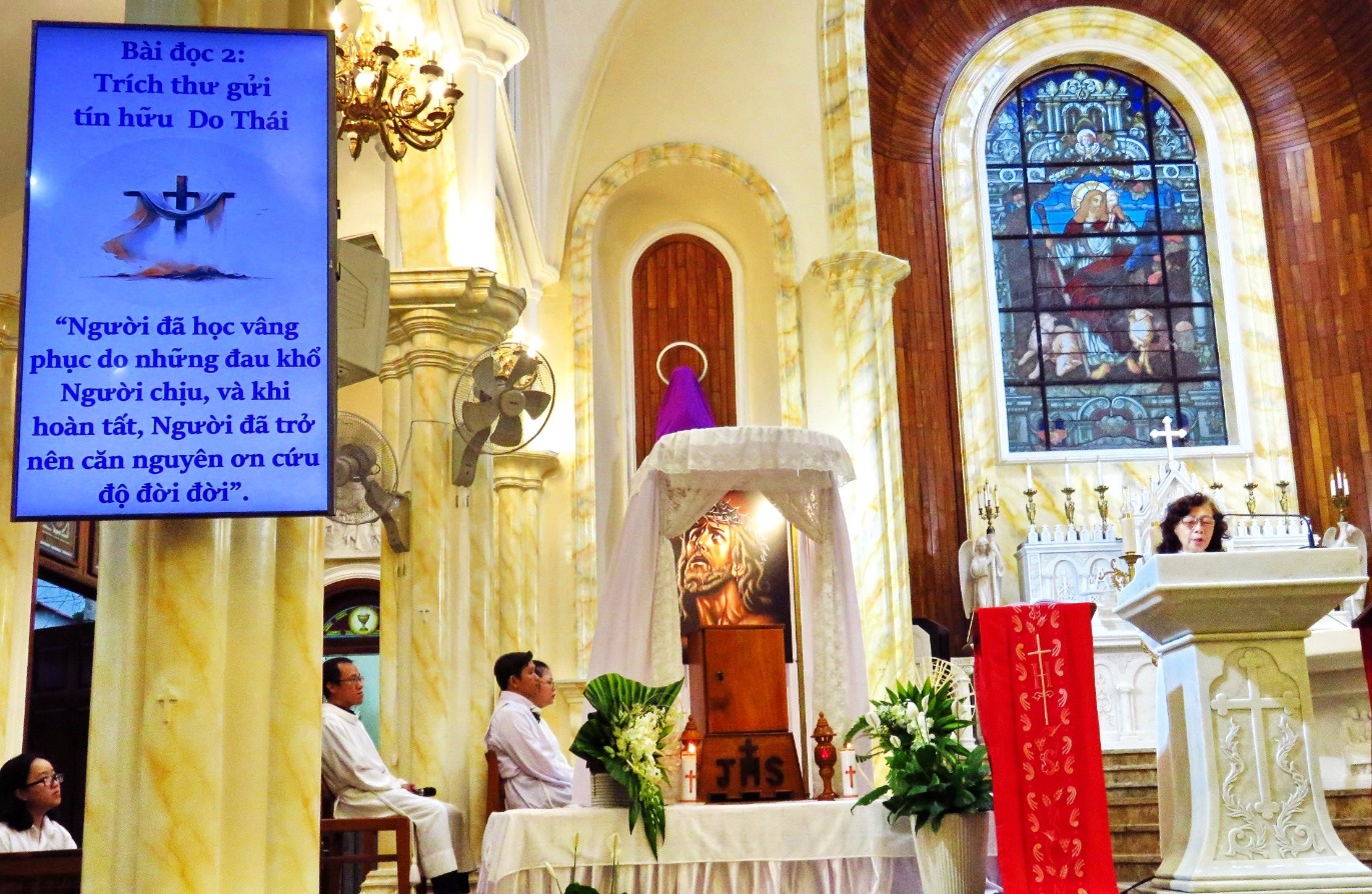 Gồm: bài đọc 1 trích sách ngôn sứ Isaia, bài đọc 2 trích trong thư Thánh Phaolô gửi tín hữu Do Thái. Sau cùng là Bài Thương Khó Chúa Giêsu theo Thánh Gioan do cha phó Antôn và hai ca viên hát.