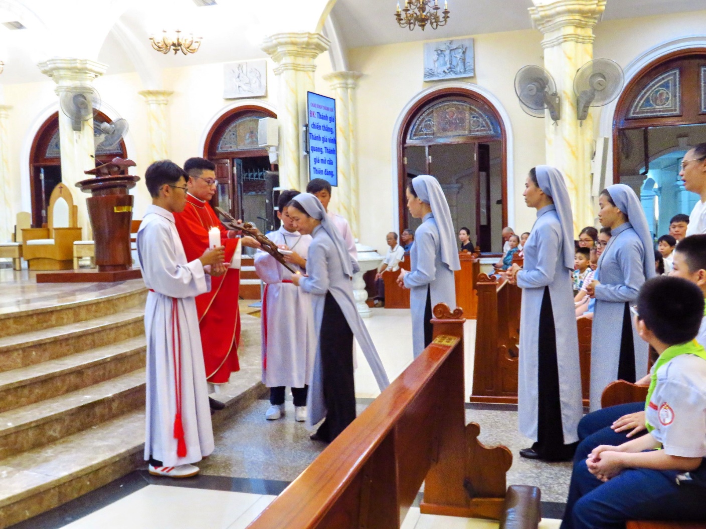 Thánh Giá được cha phó Antôn cung nghinh từ cuối nhà thờ lên cung Thánh và được nâng cao 3 lần cho tất cả mọi người có mặt trong nhà thờ quỳ cung kính và thờ lạy suy tôn. Sau đó, đại diện các cộng đoàn tu sĩ và các vị đại diện lần lượt lên hôn kính Thánh giá.
