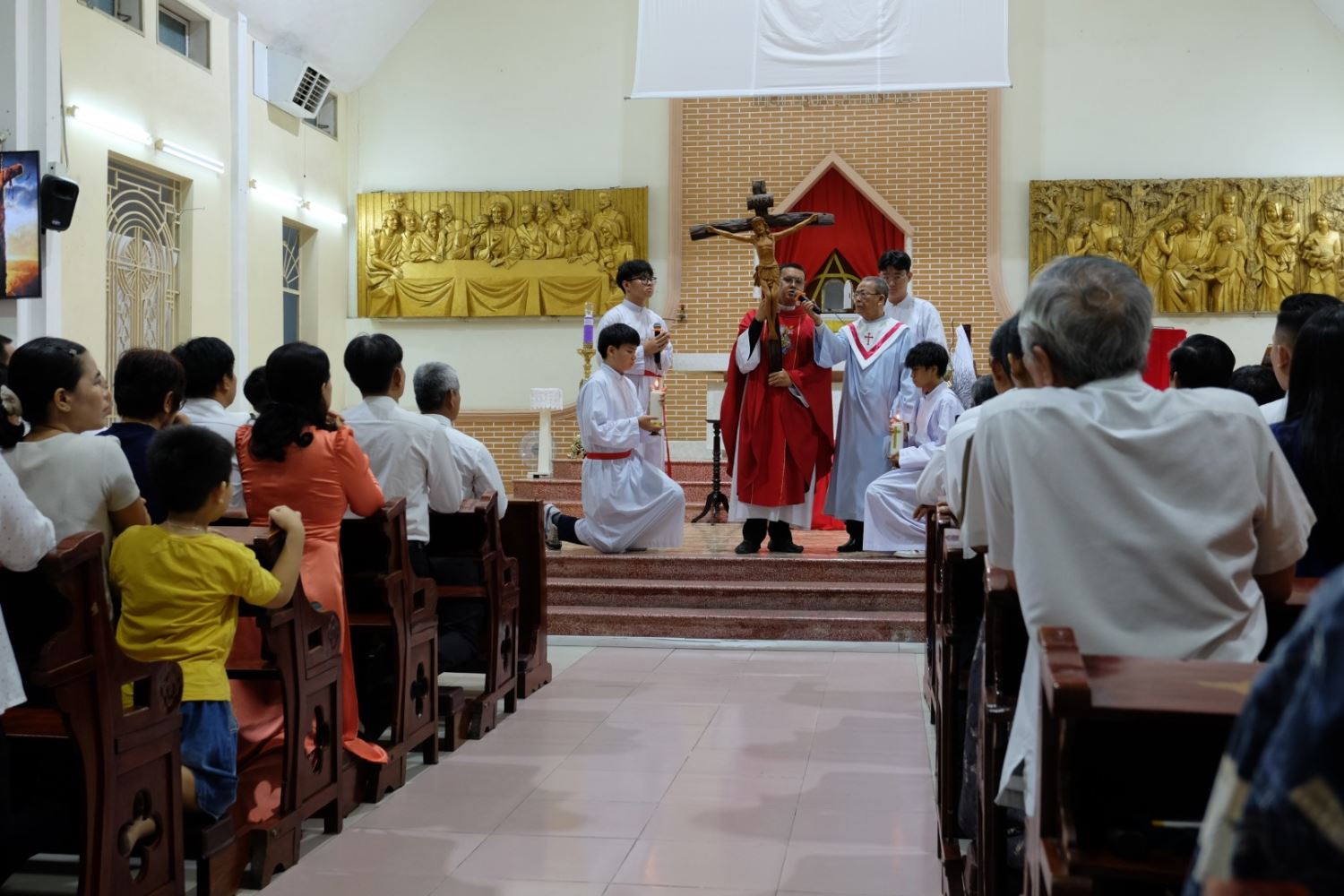 Trước nghi lễ, cộng đoàn đã sốt sắng tham dự Đàng Thánh Giá. Từng chặng đường tái hiện những đau khổ tột cùng mà Chúa Giêsu đã trải qua vì tình yêu dành cho nhân loại. Sau đó, nghi lễ trọng thể tưởng niệm Cuộc Thương Khó của Chúa được cử hành trong bầu khí trang nghiêm, thánh thiêng, do linh mục (Lm) chánh xứ Giuse Nguyễn Cảnh Thịnh chủ sự, cùng sự hiện diện sốt sắng của các nữ tu dòng Mến Thánh Giá Thủ Thiêm, đông đảo giáo dân trong giáo xứ và các khách hành hương từ các nơi.