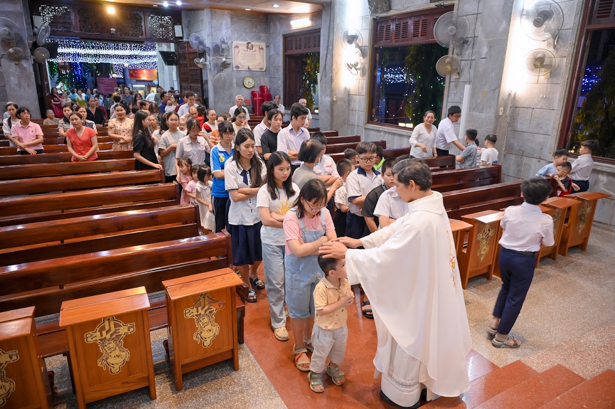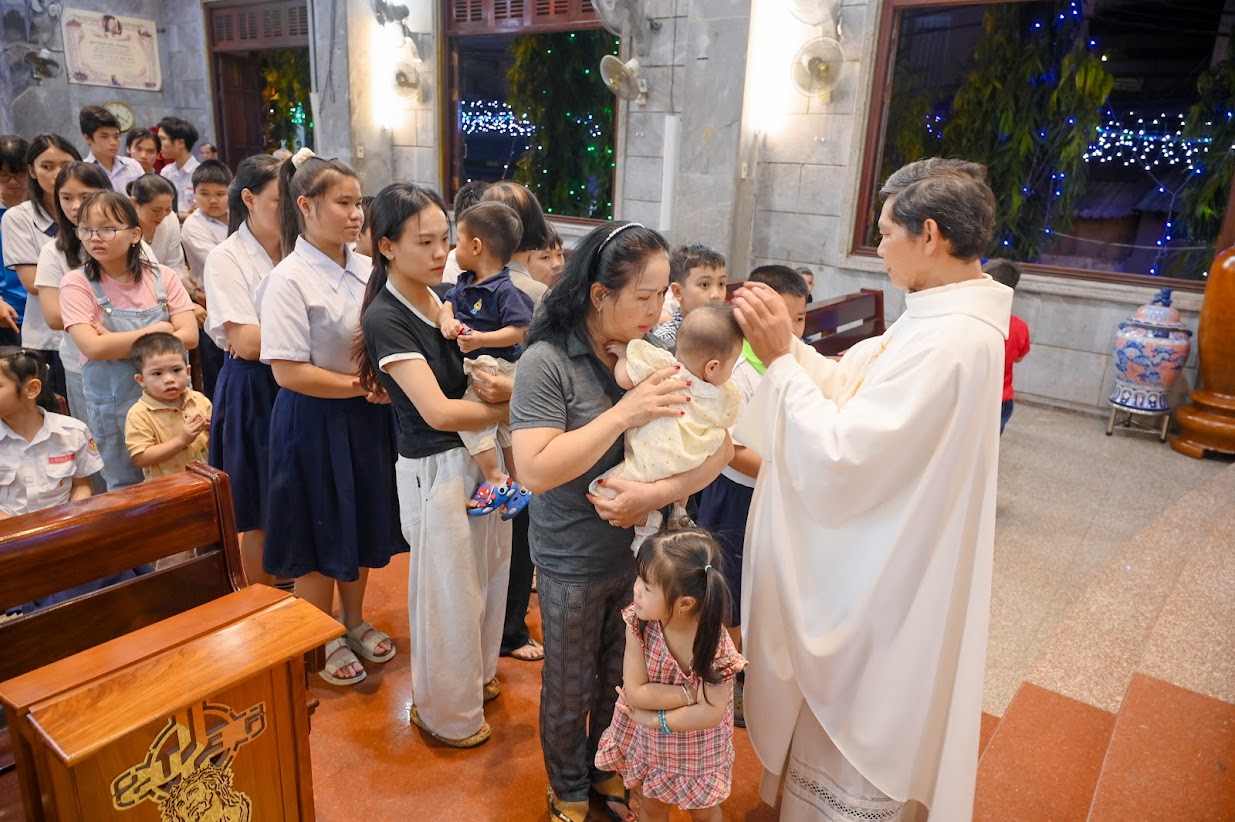 Trước khi ra về, các bậc phụ huynh bế các em nhỏ xếp thành hai hàng tiến lên trước thềm cung thánh để linh mục Gioan Baotixita Trần Quang Hiển đặt tay và chúc lành cho các em.