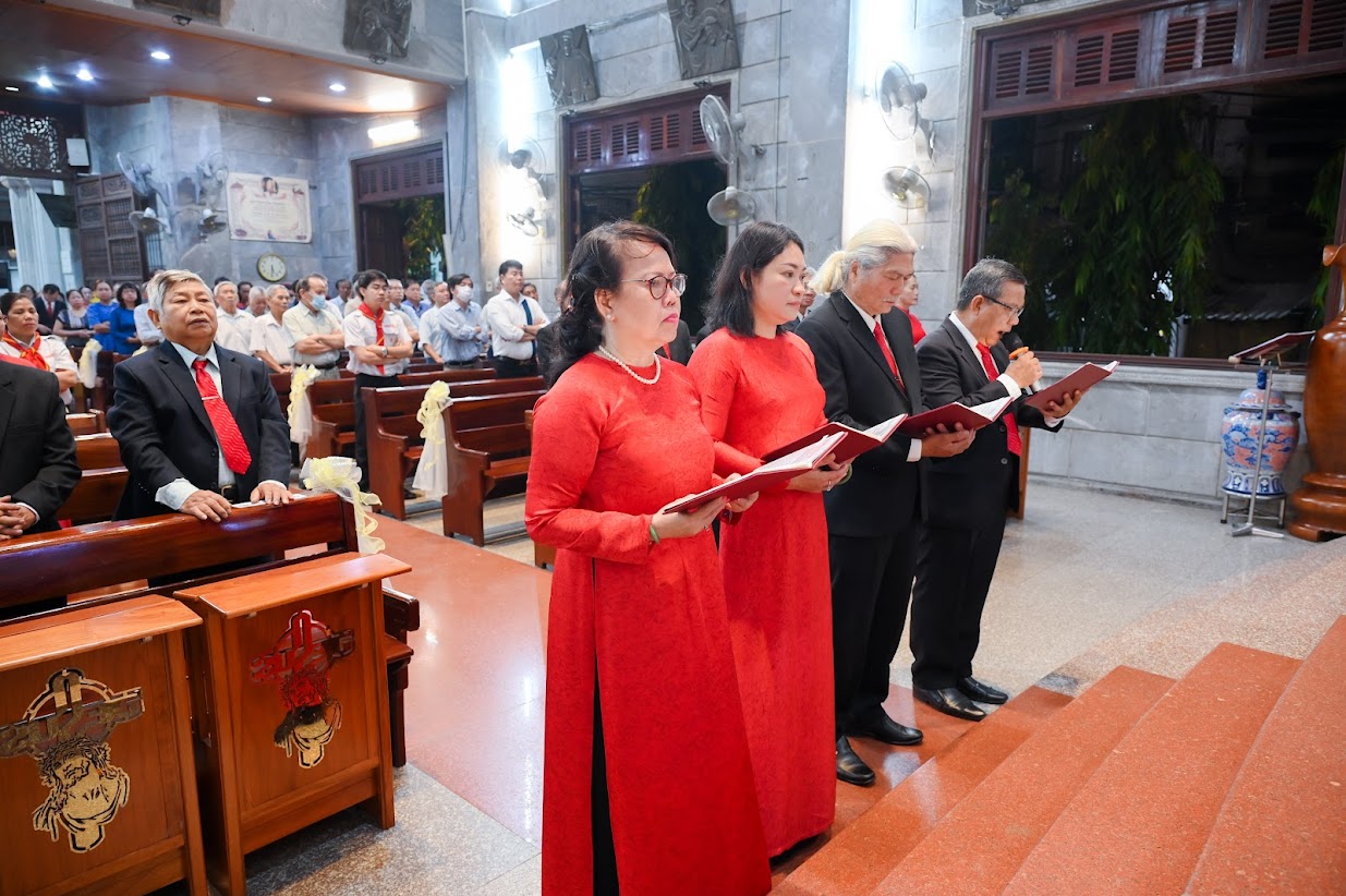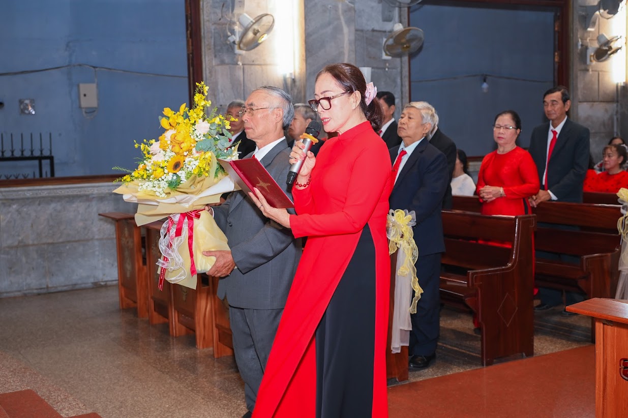 Đáp từ, linh mục chánh xứ thay mặt cộng đoàn chúc mừng bổn mạng HĐMV, đồng thời cảm ơn Ban Thường vụ đã cộng tác cùng ngài trùng tu hàng rào và lắp đèn chiếu sáng xung quanh nhà thờ, nhận được tràng pháo tay giòn giã của cộng đoàn.