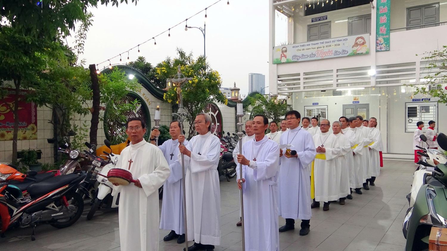 Thánh lễ khởi đầu bằng đoàn rước trang nghiêm từ khuôn viên nhà thờ tiến lên cung thánh.