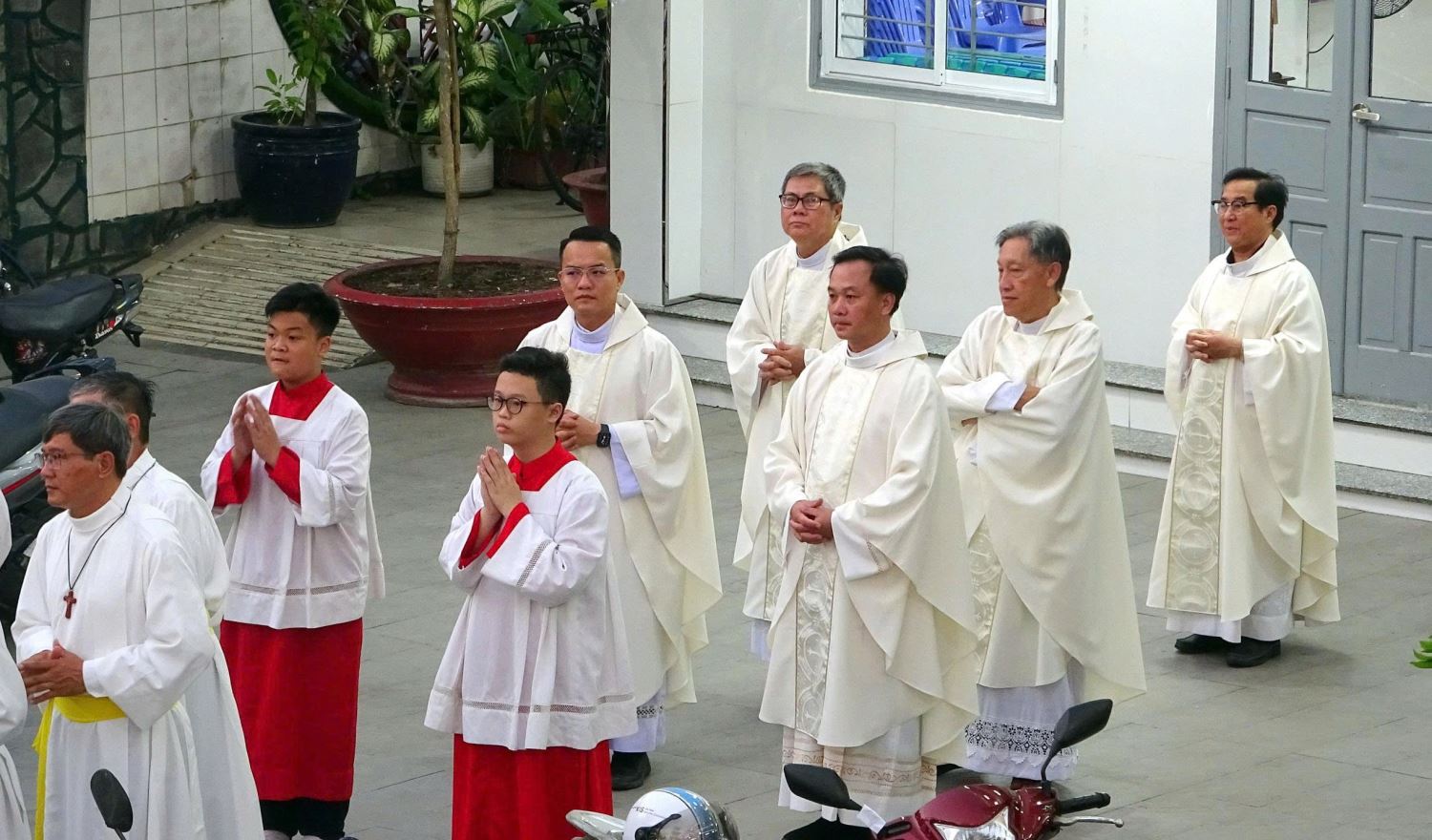 Đồng tế với ngài có linh mục phó xứ Anphongsô Nguyễn Hoàng Ngọc Anh, linh mục Phanxicô Xaviê Nguyễn Phước Chân Lý, SVD, linh mục Giuse Nguyễn Đức Dũng, linh mục Philiphê Nguyễn Bá Thông - Đặc trách Nhà Chung Huế, và linh mục Gioakim Phạm Chiến, đại diện Tổng Giáo phận Huế tại Sài Gòn.