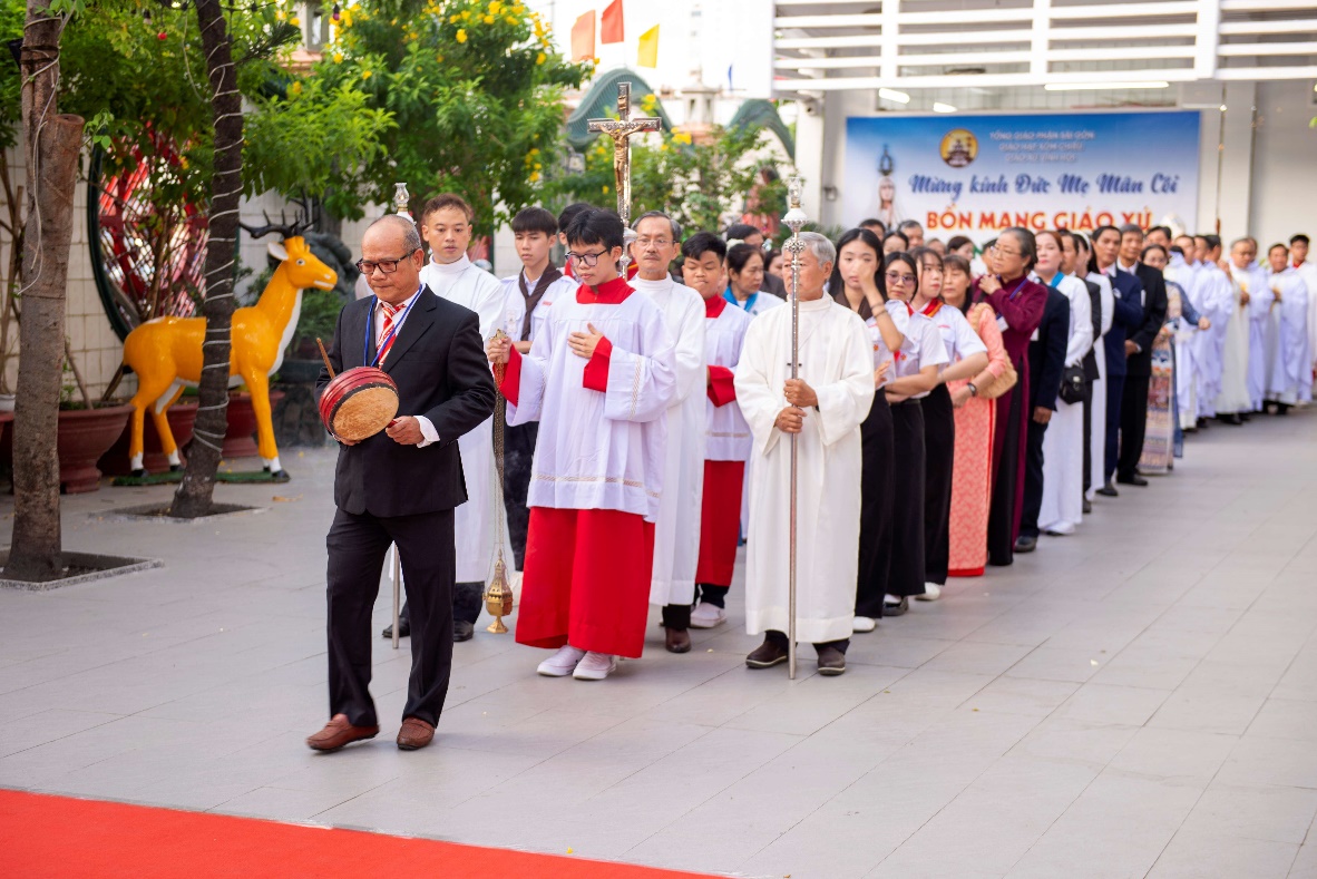 Trước Thánh lễ, đoàn rước long trọng tiến vào thánh đường trong tiếng hát ngân vang và âm thanh rộn rã của tiếng chuông nhà thờ. Tham dự đoàn rước có Hội đồng Mục vụ Giáo xứ, các giáo khu, các đoàn thể và Thiếu nhi Thánh Thể, tất cả cùng quy tụ trong niềm hiệp thông và tâm tình tạ ơn sâu xa.