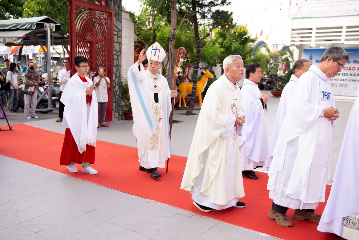 Hình ảnh đoàn rước trang nghiêm tiến bước dưới nắng chiều như gợi lại chặng đường 150 năm ân sủng - một hành trình đức tin được viết nên bằng biết bao công sức, lời cầu nguyện và tình yêu của các thế hệ cha ông đã âm thầm tiếp nối, vun đắp, xây dựng nên giáo xứ Vĩnh Hội hôm nay.