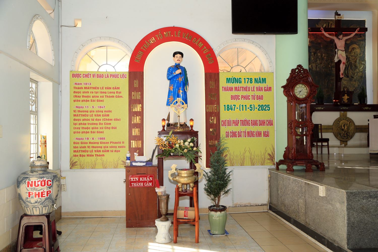 Trong nhà thờ, cộng đoàn dâng lời khấn trước tượng Thánh Matthêu Lê Văn Gẫm. Linh mục Giuse Đỗ Đức Hạnh giới thiệu đôi nét về tiểu sử Thánh Gẫm và ngôi nhà thờ, giúp mọi người hiểu rõ hơn về tấm gương đức tin của Thánh nhân.