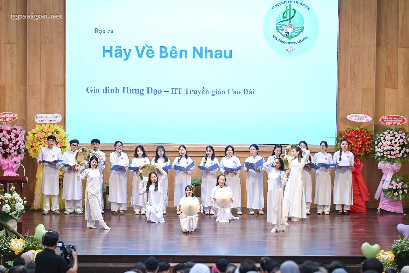 Sau đó, Đạo ca “Hãy về bên nhau” do Gia đình Hưng Đạo – Hội Thánh Truyền giáo Cao Đài thể hiện, mời gọi mọi người quay về nguồn yêu thương, hợp nhất để cùng kiến tạo hòa bình.