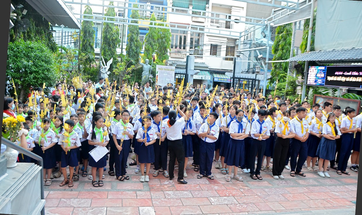 Trước Thánh lễ, linh mục Barnaba Maria cùng cộng đoàn cử hành nghi thức làm phép lá ngay trước tiền sảnh nhà thờ. Sau đó, linh mục chủ tế, thầy Phó tế Giuse Nguyễn Văn Cương, Dòng Ngôi Lời cùng các em thiếu nhi cầm cành lá trên tay, tiến vào thánh đường trong niềm hân hoan.