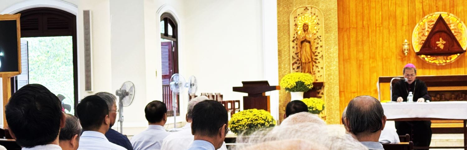 Sau khi suy niệm, cầu nguyện, xưng tội, chầu Thánh Thể và đọc Phụng vụ Giờ Kinh Trưa với nhau tại Đại chủng viện, các linh mục đã đi đến hội trường GB Phạm Minh Mẫn của Trung tâm Mục vụ TGP để lắng nghe Đức Tổng Giám mục Giuse nhắc nhở về:
