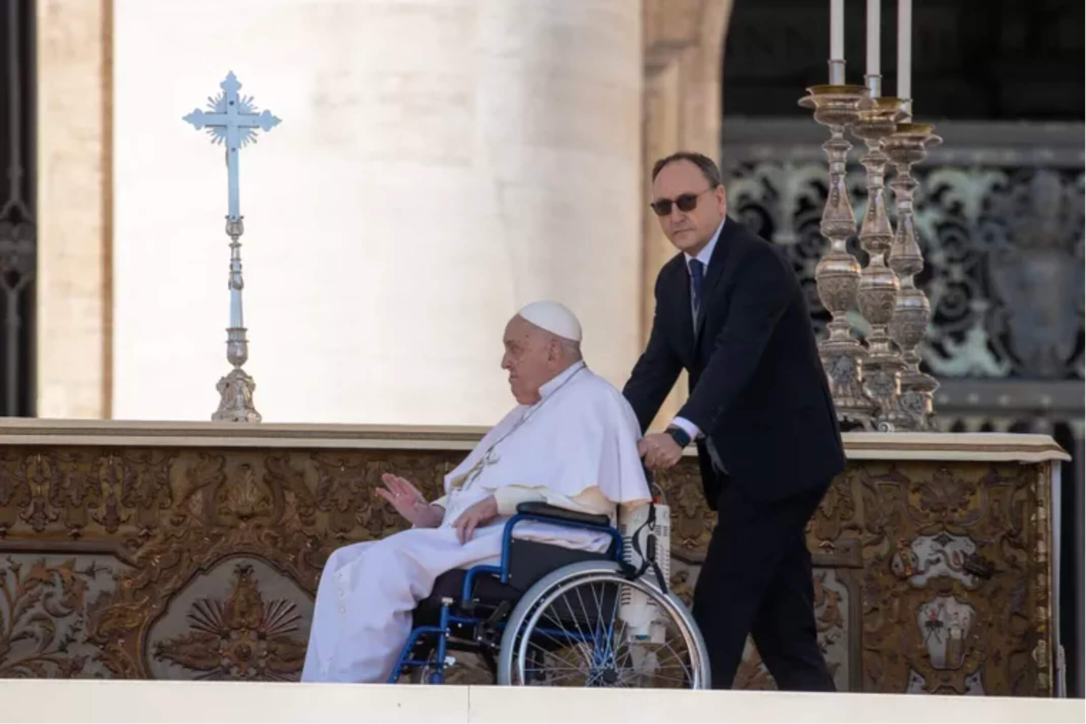 Đức Giáo hoàng Phanxicô xuất hiện cùng y tá riêng của ngài, ông Massimo Strappetti, tại Năm Thánh dành cho Người Bệnh ở Quảng trường Thánh Phêrô, Vatican, Chúa nhật ngày 6 tháng Tư năm 2025. Ảnh: Daniel Ibáñez / CNA