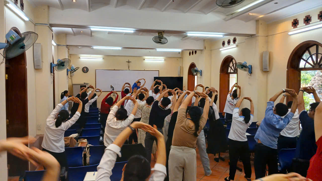 Sau hai tiết học đầu, lớp tạm nghỉ với phần giải lao ngắn và một bài aerobic nhẹ do huấn luyện viên Minh Đức hướng dẫn, giúp mọi người thư giãn, lấy lại năng lượng và làm nóng giọng. Không khí lớp học trở nên rộn ràng, đúng tinh thần “học để sống vui - nói để dâng lời.”