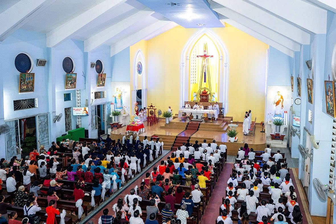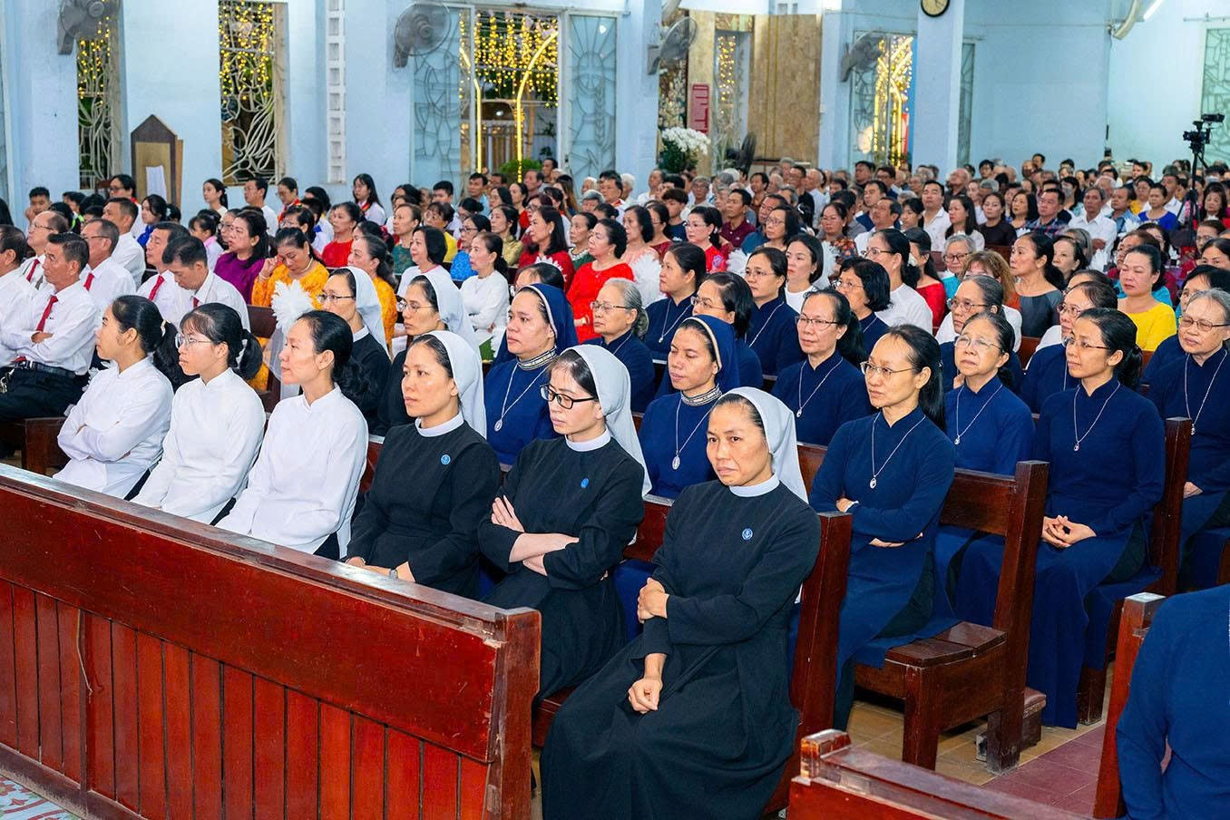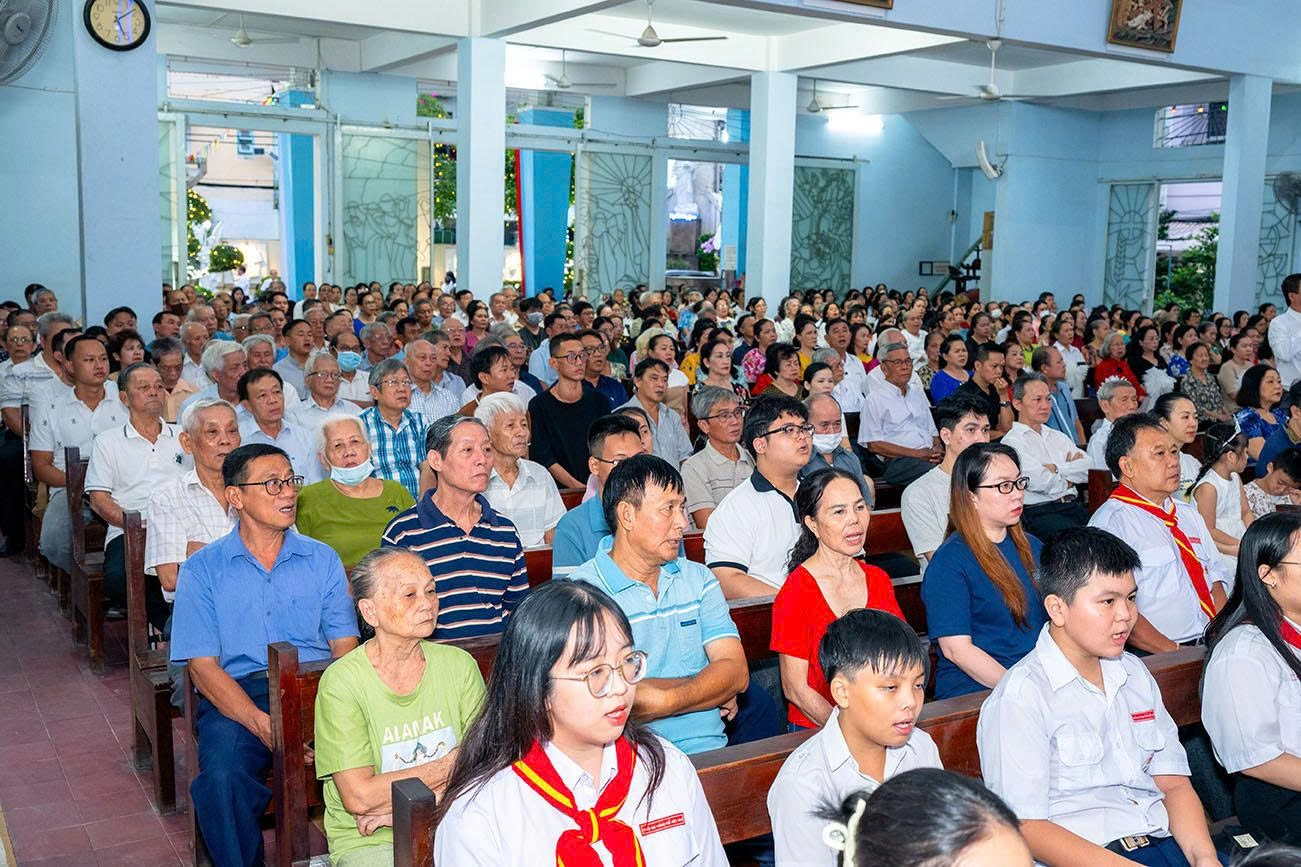 Tham dự Thánh lễ có các tu sĩ nam nữ cùng đông đảo giáo dân trong và ngoài giáo xứ, chật kín khuôn viên thánh đường.