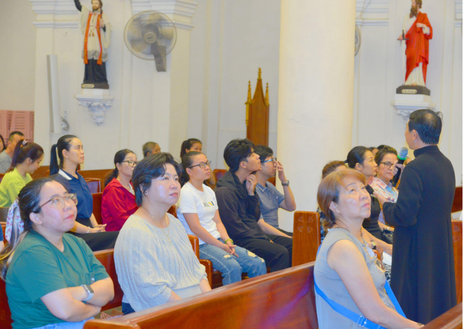 Sau Thánh lễ, cộng đoàn cùng lắng nghe phần chia sẻ đặc biệt về ý cầu nguyện tháng 10 của Đức Thánh Cha: Cầu nguyện cho sự hợp tác giữa những truyền thống tôn giáo khác nhau. Cha Phêrô Giuse Maria Hà Thiên Trúc – Chánh xứ Giáo xứ Martinô, Tổng Giáo phận Sài Gòn – được mời chia sẻ với đề tài “Đối thoại Liên tôn trong đời sống”.