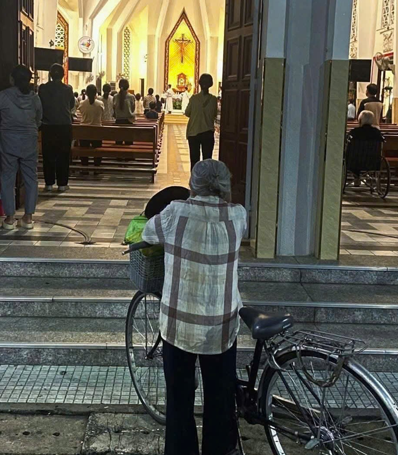 Một cụ già dừng xe đạp nơi bậc thềm. Không bước vào được như mọi người, cụ đứng ở ngoài, hai tay tựa nhẹ lên chiếc xe cũ, ánh mắt hướng về bàn thờ đang rực sáng bên trong, chỉ vài bậc thềm thôi đã cản ngăn khoảng cách địa lý của cụ và Chúa nhưng thật ra lòng cụ thì đã ở rất gần Chúa.