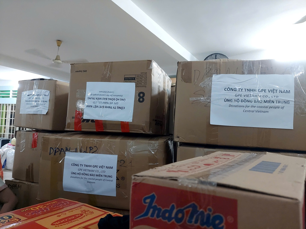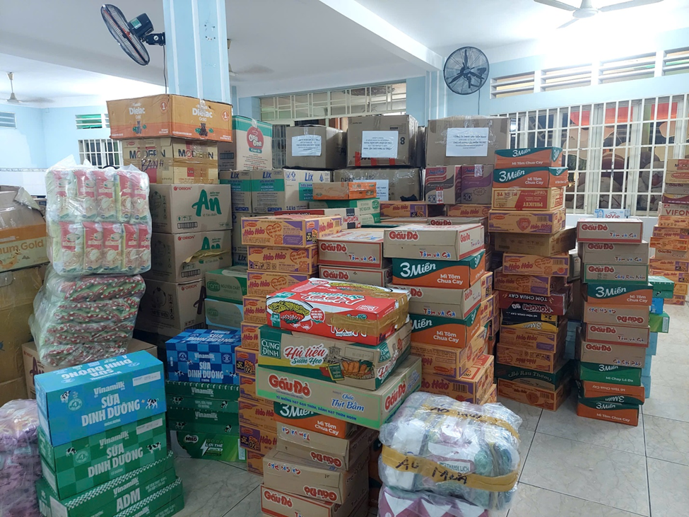 - Hàng trăm thùng mì, đường, sữa, nước suối, bánh, hạt nêm, xà bông, kem đánh răng
