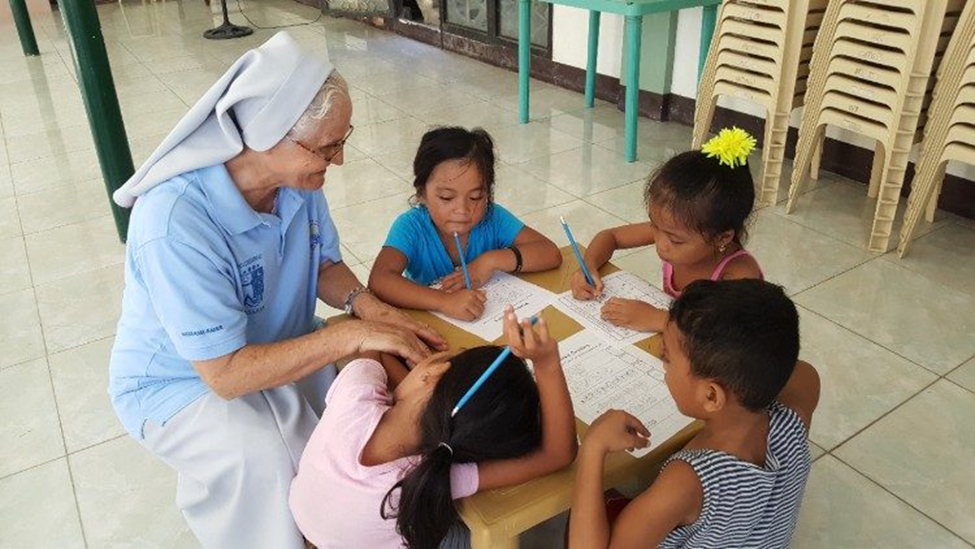 Nữ tu Lourdes dạy các em nhỏ tập viết