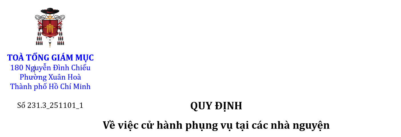 Để các sinh hoạt phụng vụ tại các nhà nguyện trong Tổng giáo phận được cử hành theo đúng Giáo luật và trong sự hiệp thông với Tổng giáo phận, kính xin quí cha vui lòng thực hiện theo các quy định sau đây: