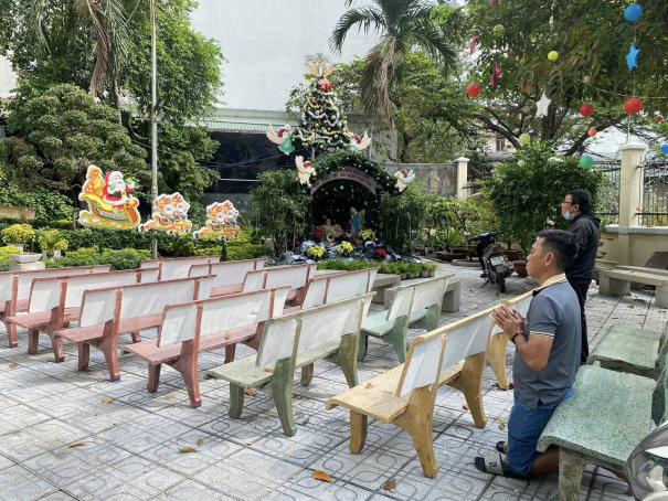 Hôm nay chúng tôi găp những hình ảnh rất đẹp: Có những người quỳ cầu nguyện bên hang đá tại sân nhà thờ. Chắc hẳn họ đang gửi lên Chúa Hài Đồng những khó khăn, bất trắc trong cuộc sống.