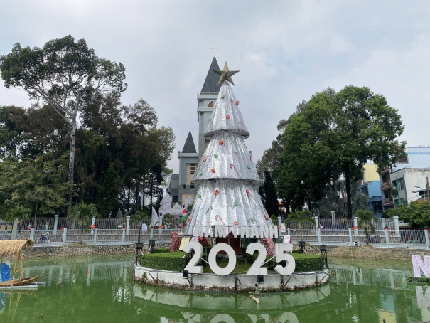 Nhà thờ có hồ nước trước cổng - nét hiếm thấy tại giáo phận Sài Gòn. Mùa Giáng Sinh, hồ nước được trang hoàng với tiểu cảnh cây thông bạc, số 2025, chữ Noel…