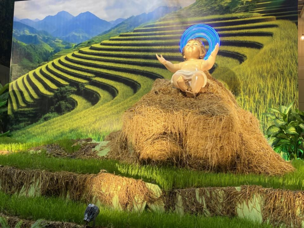 Ở góc sân cuối nhà thờ có điểm nhấn là hình tượng Hài Nhi Giê-su với nền ruộng bậc thang Tây Bắc, gợi nhớ vùng truyền giáo rộng lớn của giáo phận Hưng Hóa. Nhưng thật ra, sứ vụ truyền giáo bắt đầu ngay trong đời sống mỗi ngày, đâu phải ra đi mới là thừa sai, nhưng nơi mỗi Kitô hữu là một môn đệ thừa sai.