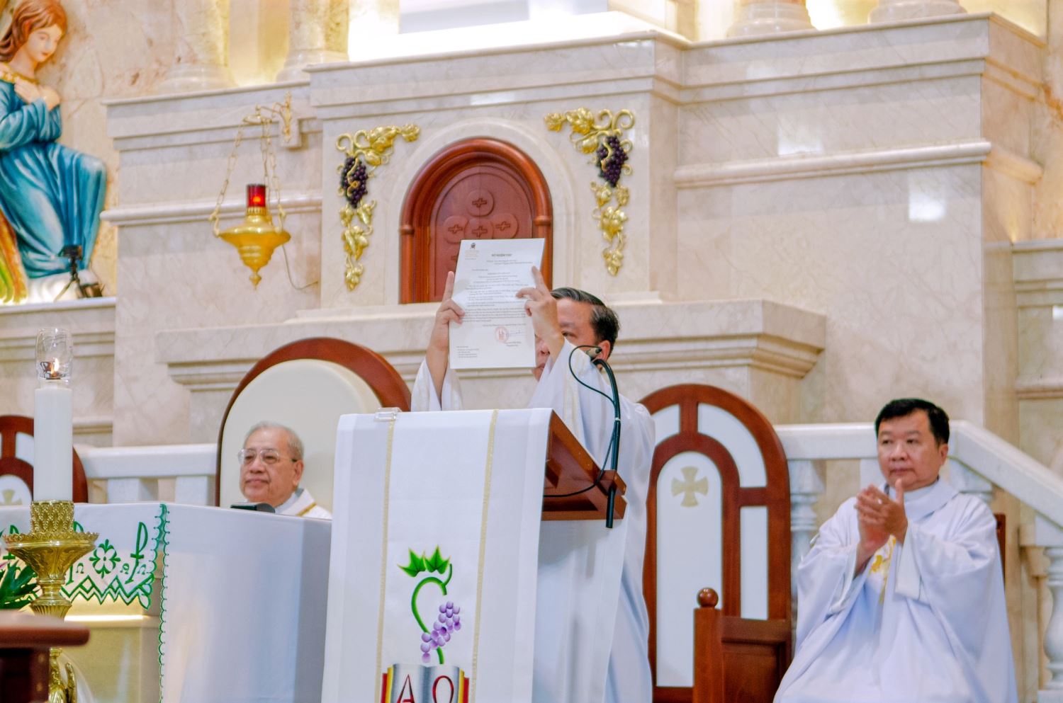 Sau lời giới thiệu của người dẫn lễ, cha Gioan Baotixita, Hạt trưởng công bố quyết định của Đức Tổng Giám mục Giuse Nguyễn Năng về việc bổ nhiệm cha Phêrô làm tân chánh xứ và cha Gioan làm tân phó xứ.