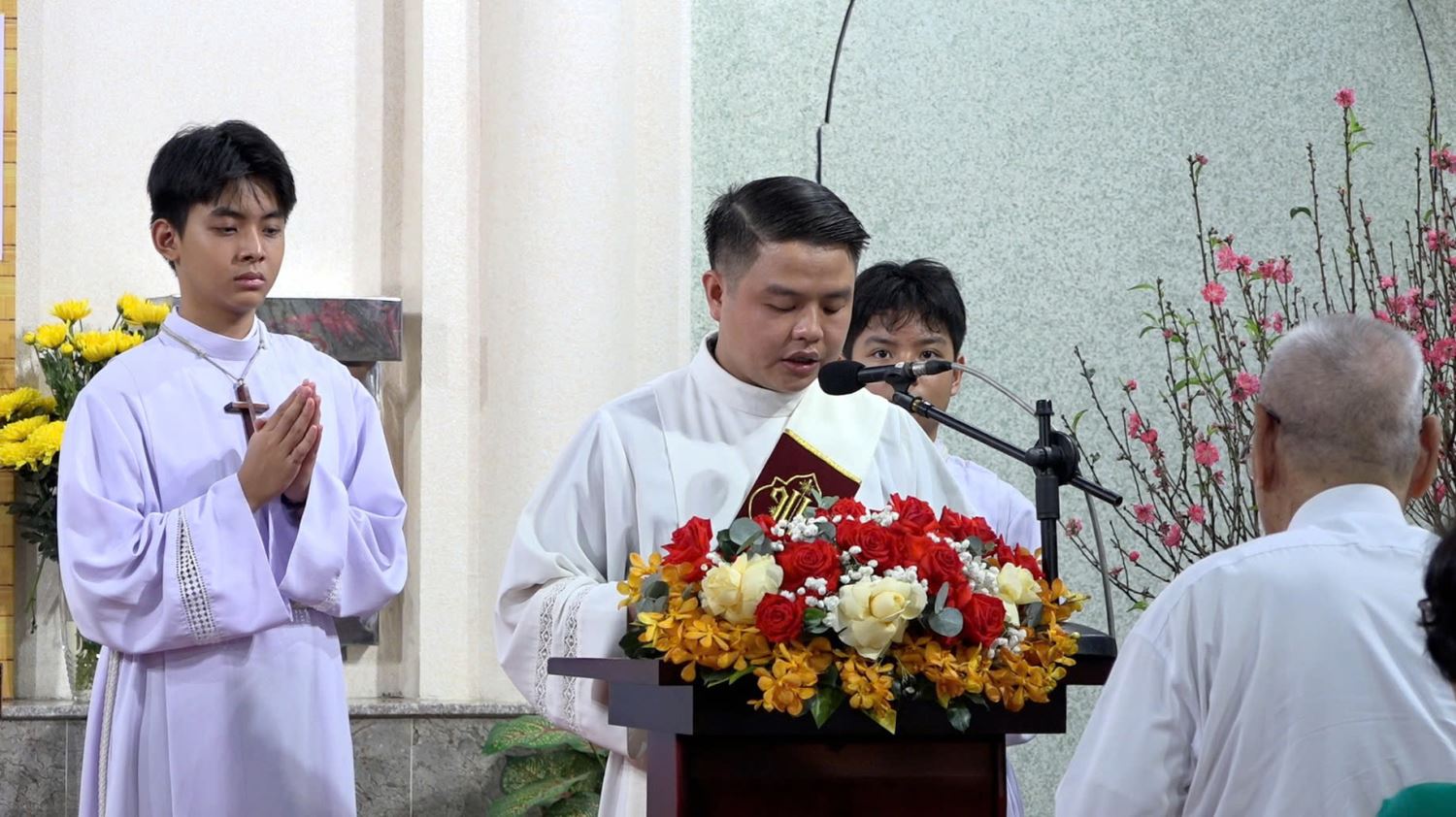 Đáp từ, Linh mục chánh xứ gửi lời chúc năm mới bình an, sức khỏe và hạnh phúc đến từng gia đình, đồng thời mời gọi cộng đoàn tiếp tục đem ánh sáng Lời Chúa đến cho mọi người, để tất cả cùng được hưởng ơn cứu độ.
