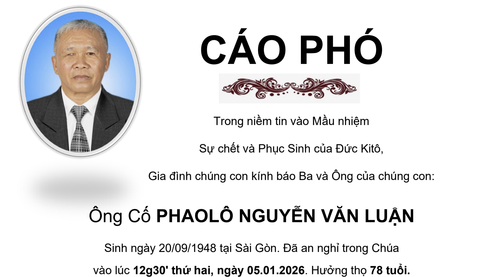 - Cáo phó: Thân phụ của Lm Anrê Nguyễn Công Thái
