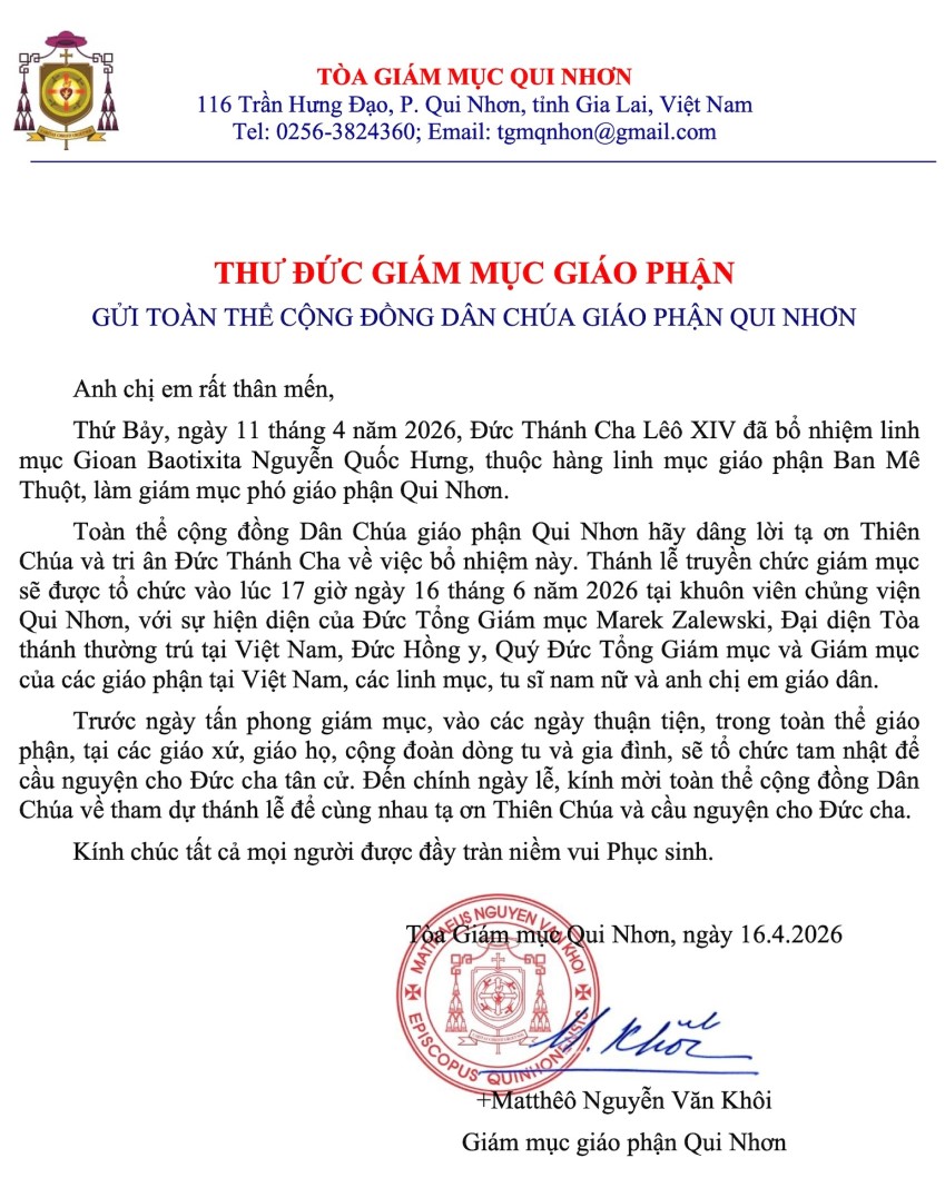 Tòa Giám mục Qui Nhơn: Thông báo về Thánh lễ Truyền chức Giám mục phó