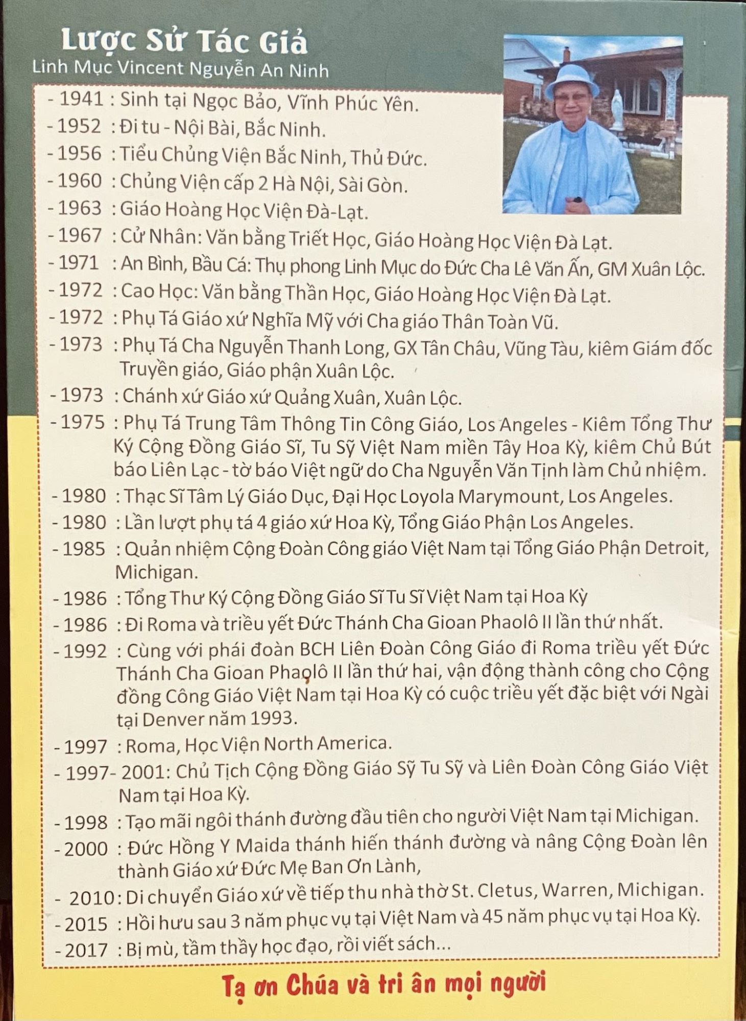 • Ngày 29.04.1975: Sang Hoa Kỳ, phục vụ tại giáo phận Los Angeles rồi Michigan.