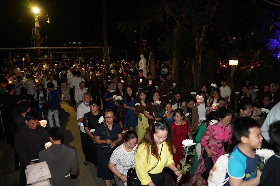 Kết thúc Thánh lễ có nghi thức hôn Thánh tích và rước kiệu Thánh tích đến dâng hoa tại Đài Thánh nhân trong khuôn viên tu viện.