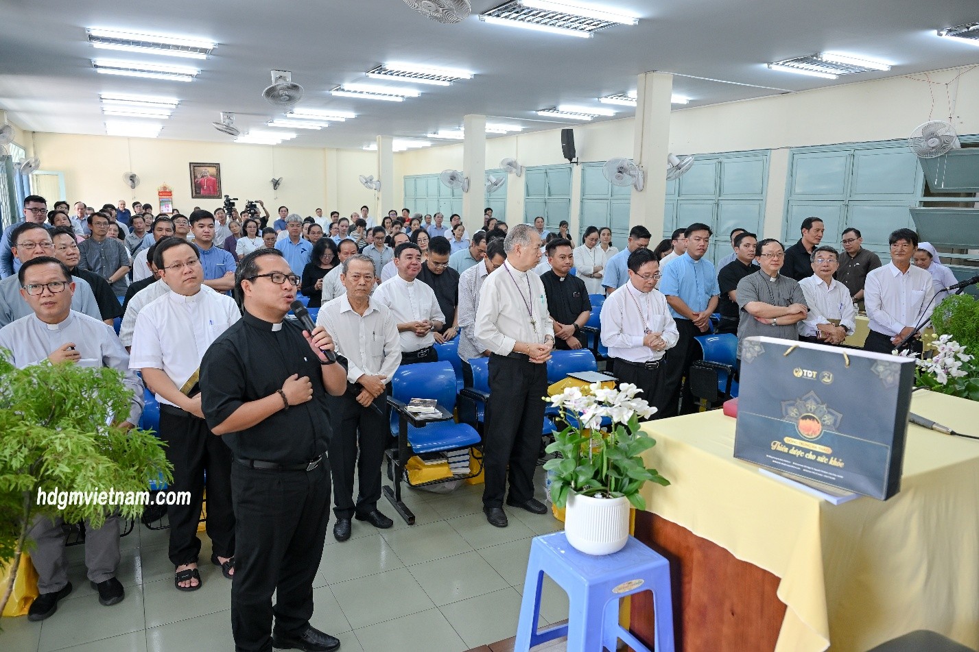 Đại diện UBTN – Linh mục Rôcô Nguyễn Duy, Thư ký Ủy ban – thay mặt cộng đoàn bày tỏ lòng tri ân sâu sắc đến Đức cha Aloisiô, cầu chúc ngài luôn bình an và tràn đầy ơn Chúa. Ban tổ chức trao quà tri ân đến hai vị Giám mục trong bầu khí hiệp thông, thắm đượm tình huynh đệ.