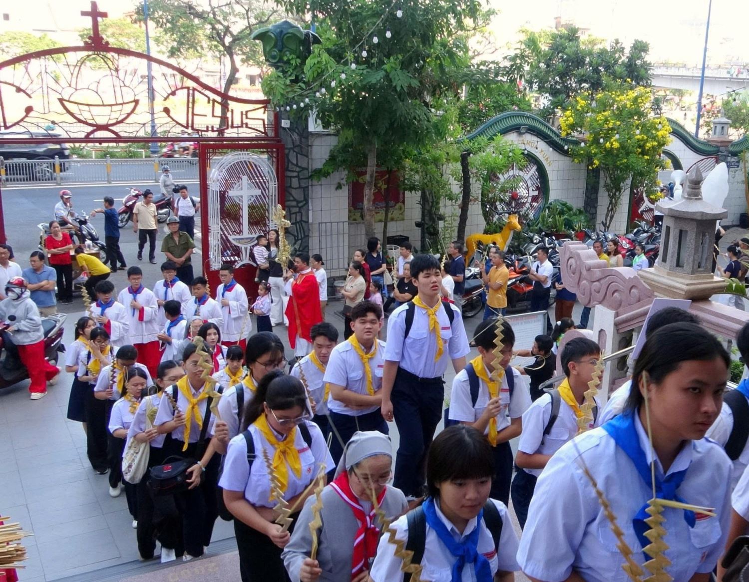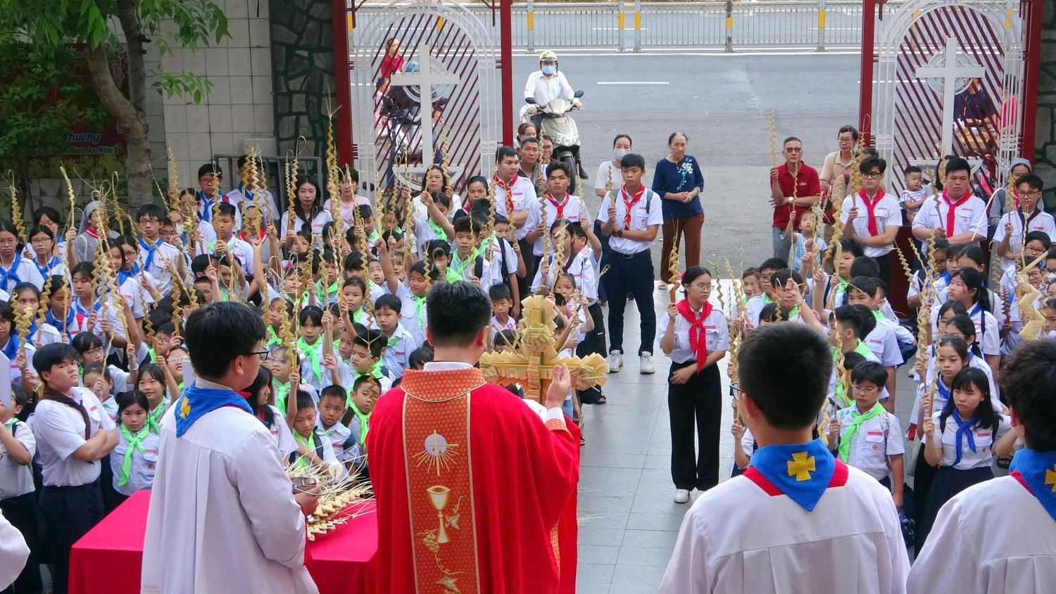 Trước lễ, cộng đoàn tập trung tại tượng đài Đức Mẹ La Vang làm phép lá, rồi cùng linh mục chủ tế rước kiệu quanh khuôn viên giáo xứ. Hành trình ngắn nhưng giàu ý nghĩa, tuyên xưng đi theo Chúa dù con đường không phải lúc nào cũng bằng phẳng. Đoàn rước tiến vào thánh đường, gợi nhớ dân thành Giêrusalem xưa tung hô Vua cưỡi lừa.