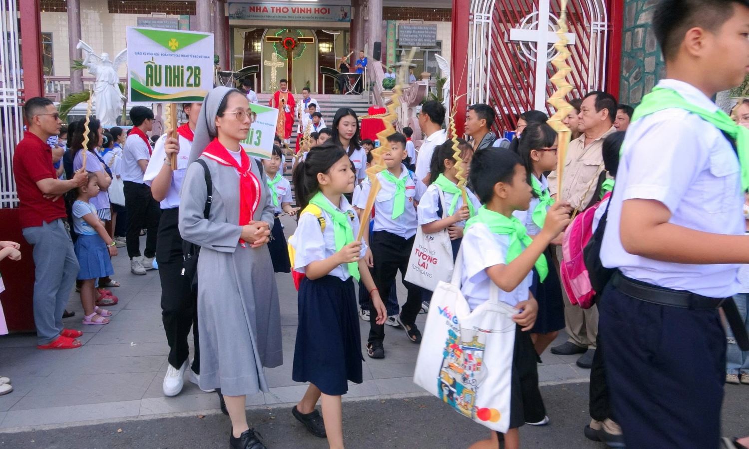 TGPSG -- Vào lúc 8g15 sáng Chúa nhật, ngày 29.03.2026, tại giáo xứ Vĩnh Hội, xứ đoàn Thiếu Nhi Thánh Thể long trọng cử hành Thánh lễ Lá, khai mạc Tuần Thánh, do linh mục Phó xứ Anphongsô Nguyễn Hoàng Ngọc Anh chủ tế. Tham dự Thánh lễ có các tu sĩ, các anh chị huynh trưởng, giáo lý viên, các em thiếu nhi và phụ huynh.