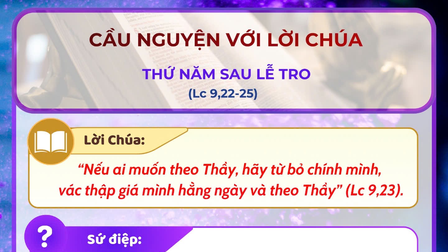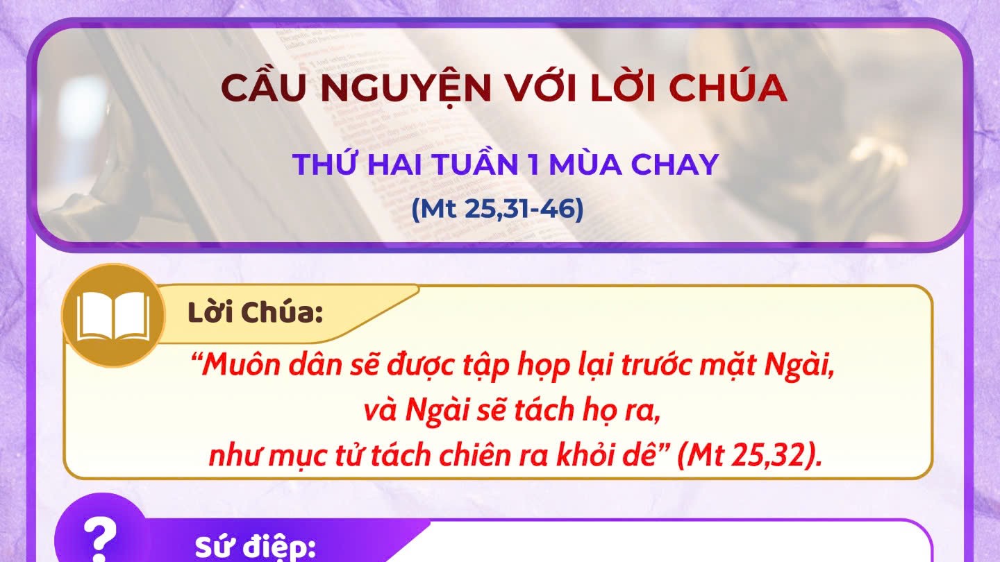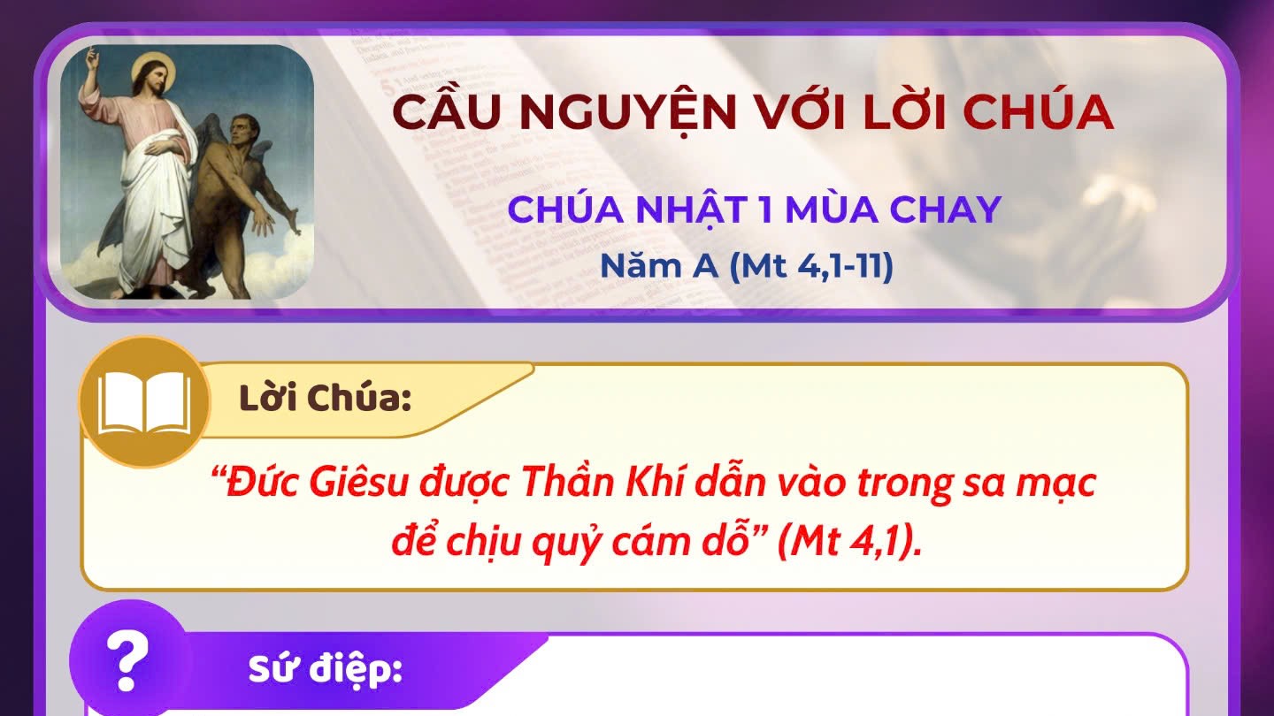 Cầu nguyện với Lời Chúa 12345678910 Cầu nguyện với Lời Chúa: thứ Tư 1 mùa chay năm A Cầu nguyện với Lời Chúa: thứ Ba 1 mùa chay năm A Cầu nguyện với Lời Chúa: thứ Hai 1 mùa chay năm A Cầu nguyện với Lời Chúa: Chúa Nhật 1 mùa chay năm A Cầu nguyện với Lời Chúa: Thứ Bảy sau Lễ Tro Cầu nguyện với Lời Chúa: Thứ Sáu Lễ Tro Cầu nguyện với Lời Chúa: Thứ Năm Lễ Tro Cầu nguyện với Lời Chúa: Mồng Ba Tết Cầu nguyện với Lời Chúa: Mồng Hai Tết Cầu nguyện với Lời Chúa: Thứ Tư Lễ Tro Cầu nguyện với Lời Chúa: Mồng Một Tết Cầu nguyện với Lời Chúa: Thánh Lễ Giao Thừa Cầu nguyện với Lời Chúa: Chúa Nhật 6 thường niên năm A Cầu nguyện với Lời Chúa: thứ Bảy tuần 5 thường niên năm A Cầu nguyện với Lời Chúa: thứ Sáu tuần 5 thường niên năm A Cầu nguyện với Lời Chúa: thứ Năm tuần 5 thường niên năm A Cầu nguyện với Lời Chúa: thứ Tư tuần 5 thường niên năm A Cầu nguyện với Lời Chúa: thứ Ba tuần 5 thường niên năm A Cầu nguyện với Lời Chúa: thứ Hai 5 thường niên năm A Cầu nguyện với Lời Chúa: Chúa Nhật 5 thường niên năm A Cầu nguyện với Lời Chúa: thứ Bảy 4 Thường niên năm A Cầu nguyện với Lời Chúa: thứ Sáu 4 Thường niên năm A Cầu nguyện với Lời Chúa: thứ Năm 4 Thường niên năm A Cầu nguyện với Lời Chúa: thứ Tư 4 Thường niên năm A Cầu nguyện với Lời Chúa: thứ Ba 4 Thường niên năm A Cầu nguyện với Lời Chúa: Chúa Nhật 4 Thường niên năm A Cầu nguyện với Lời Chúa: thứ Bảy 3 Thường niên năm A Cầu nguyện với Lời Chúa: thứ Sáu 3 Thường niên năm A Cầu nguyện với Lời Chúa: thứ Năm 3 Thường niên năm A Cầu nguyện với Lời Chúa: thứ Tư 3 Thường niên năm A 12345678910