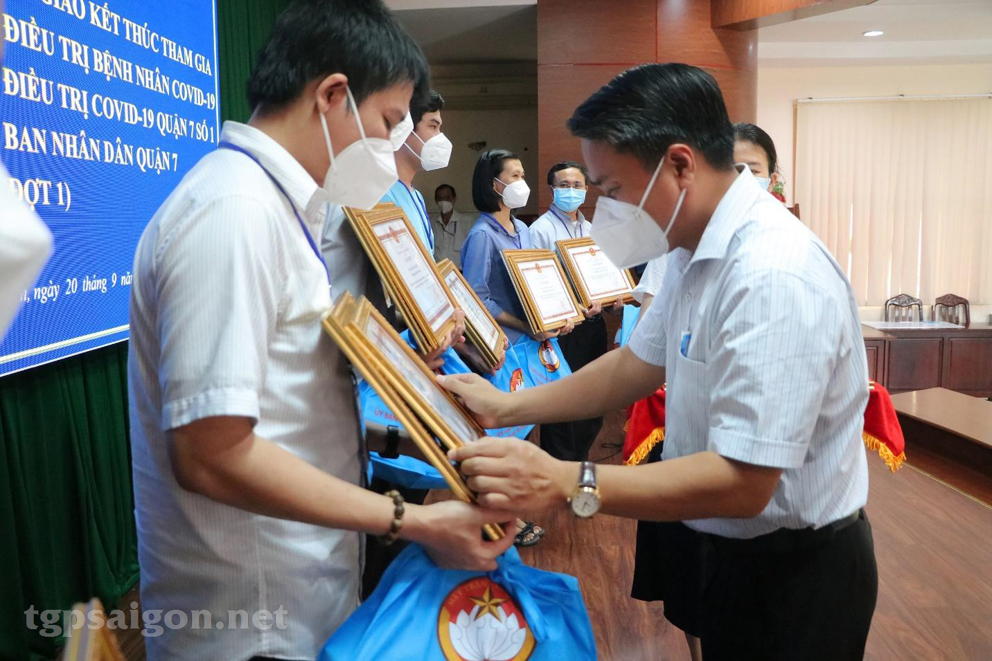 Kết thúc buổi lễ, Ban Thường trực Ủy ban MTTQ Việt Nam Thành phố và UBND Q.7 đã trao Giấy biểu dương và quà tặng cho 19 tình nguyện viên Công giáo hoàn thành tốt nhiệm vụ trong một tháng phục vụ tại Bệnh viện Dã chiến điều trị Covid-19 Quận 7 số 1.