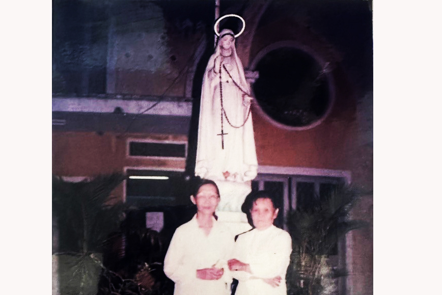 Tấm hình kỷ niệm ngày Bà Nội (mặc áo dài trắng) được ơn trở lại với Chúa, dưới chân Đức Mẹ, tháng 7/1999