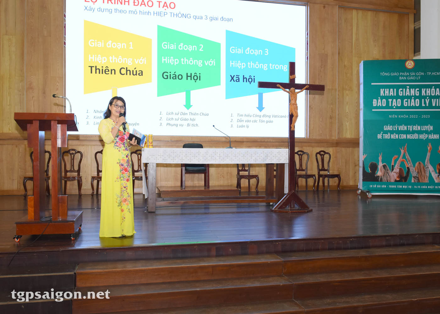 Sau khi các GLV tập hát múa bài ca chủ đề “GLV hiệp hành”, cô Giám học Maria Mađalêna Phạm Thị Thúy thông báo về Mục đích và Chương trình đào tạo khóa 15 theo 3 chiều kích Hiệp Thông qua 3 giai đoạn: