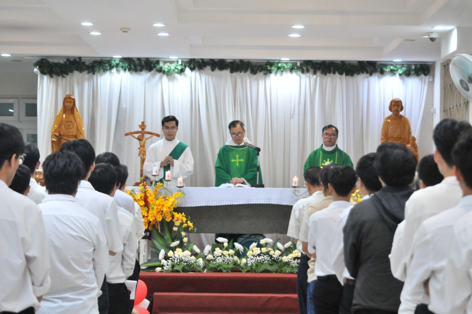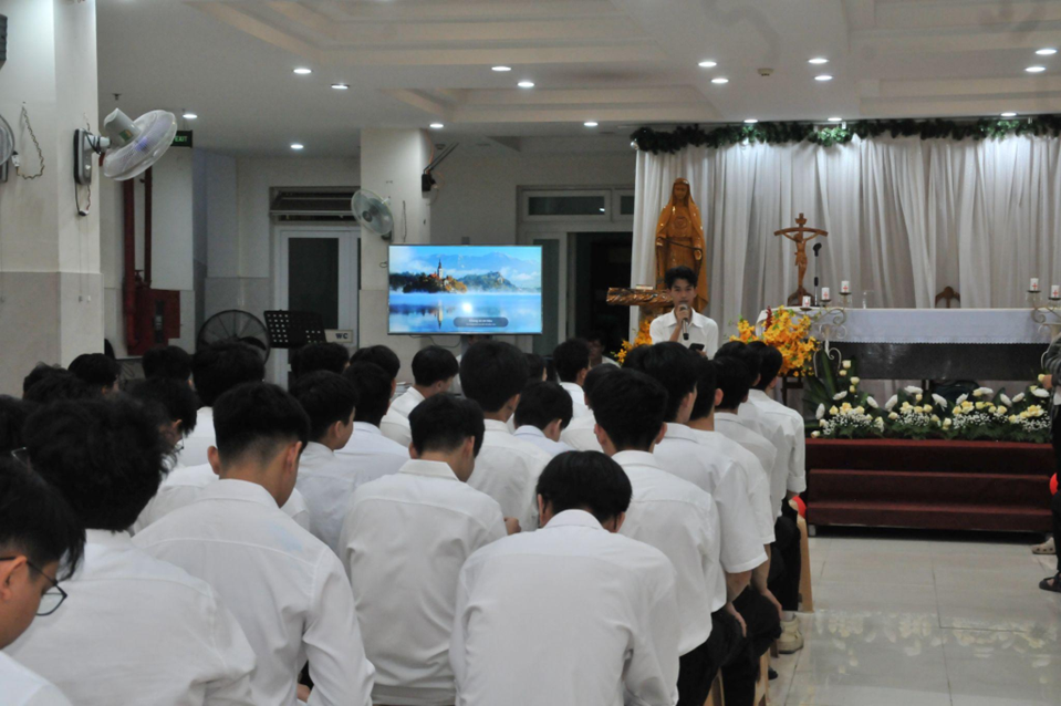 Trong bài giảng, thầy phó tế Giuse Đào Duy Hiếu chia sẻ với cộng đoàn về hình ảnh Chiên Thiên Chúa, vừa là Người Tôi Trung đau khổ theo lời ngôn sứ Isaia, vừa là Chiên Vượt Qua mang lại ơn giải thoát và bình an cho nhân loại. Thầy mời gọi các sinh viên không chỉ lãnh nhận ân huệ, mà còn được mời gọi trở nên dấu chứng của tinh thần dấn thân, bắt đầu từ những việc nhỏ bé và âm thầm trong đời sống thường ngày.