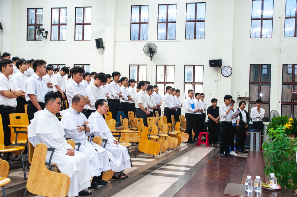 Đầu lễ, linh mục chủ tế gửi lời chào đến các linh mục, các thầy và các bạn sinh viên, đồng thời mời gọi cộng đoàn hiệp thông cầu nguyện: