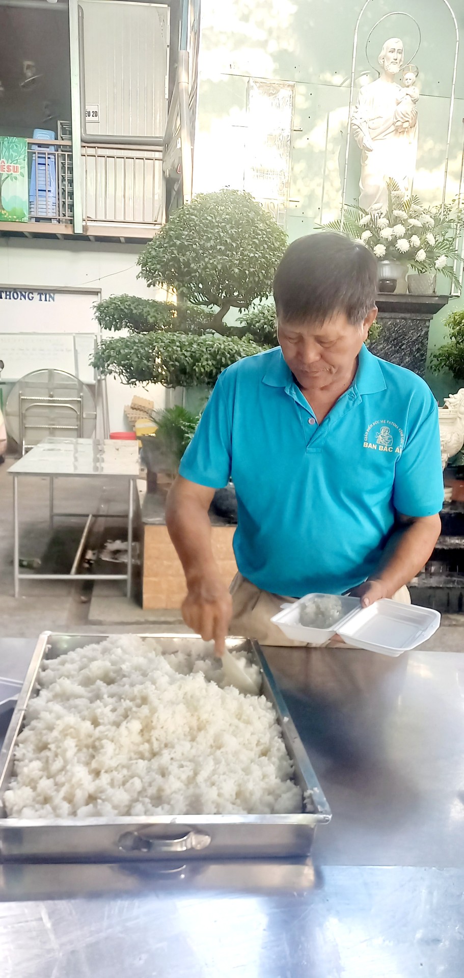 Đúng 9g30, cha quản nhiệm Giuse Nguyễn Ngọc Thông đến làm phép của ăn; sau đó, chương trình phát cơm chính thức bắt đầu. Những đôi tay nhanh nhẹn thoăn thoắt chia từng phần cơm, như hiện thực hóa lời mời gọi của Chúa: “Các con hãy cho họ ăn.”