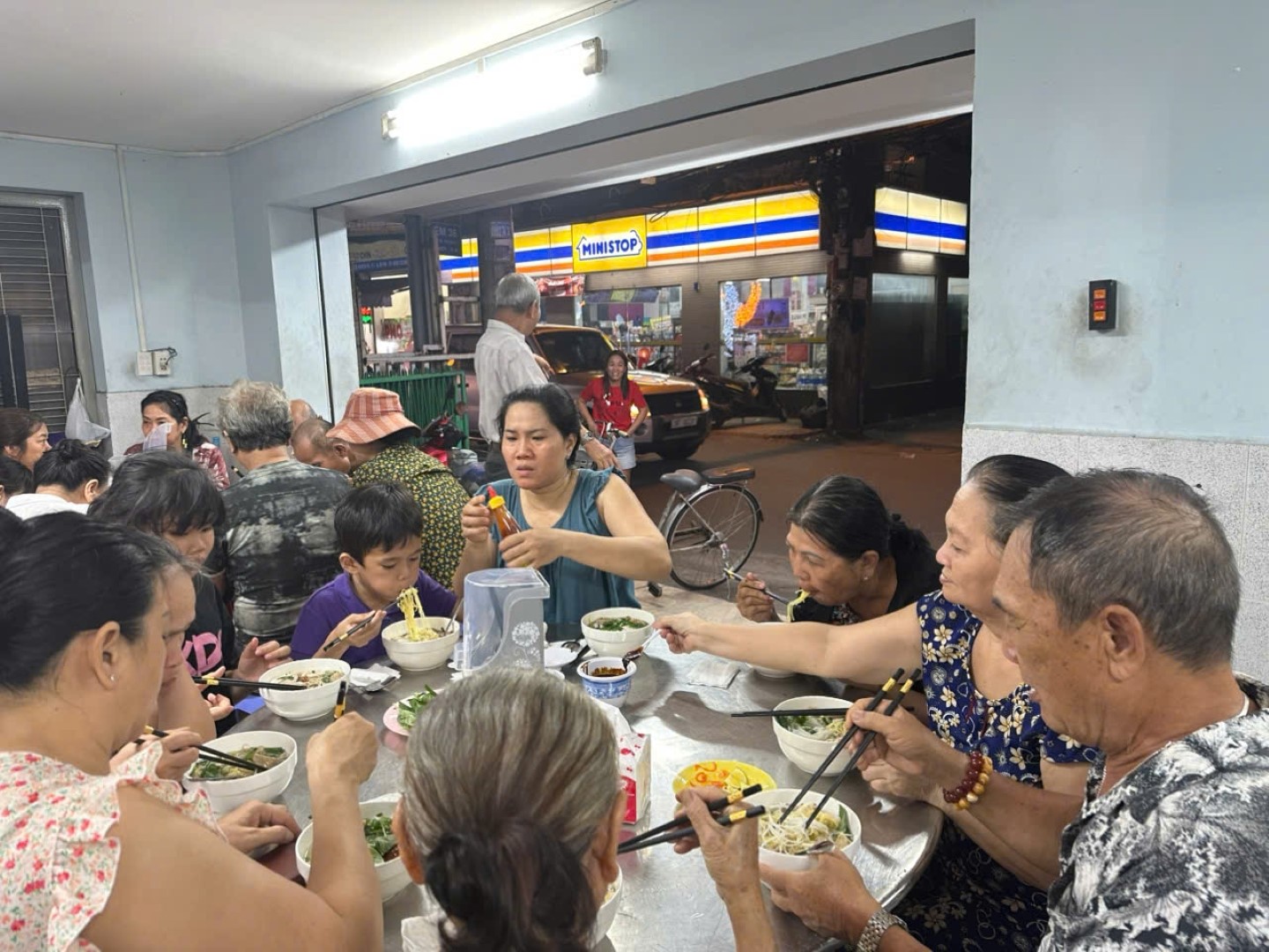 Nghi thức vừa xong, các anh chị trong màu áo trắng YÊU NHƯ GIÊSU đã bắt tay vào việc. Mỗi người một khâu, nồi nước lèo được mở ra mùi thơm hòa cùng làn khói nghi ngút được múc vào từng tô đem lên phục vụ. Những vị khách được phục vụ là những anh em công nhân, người già neo đơn cũng như các bác bán hàng rong trên đường phố vào thưởng thức.