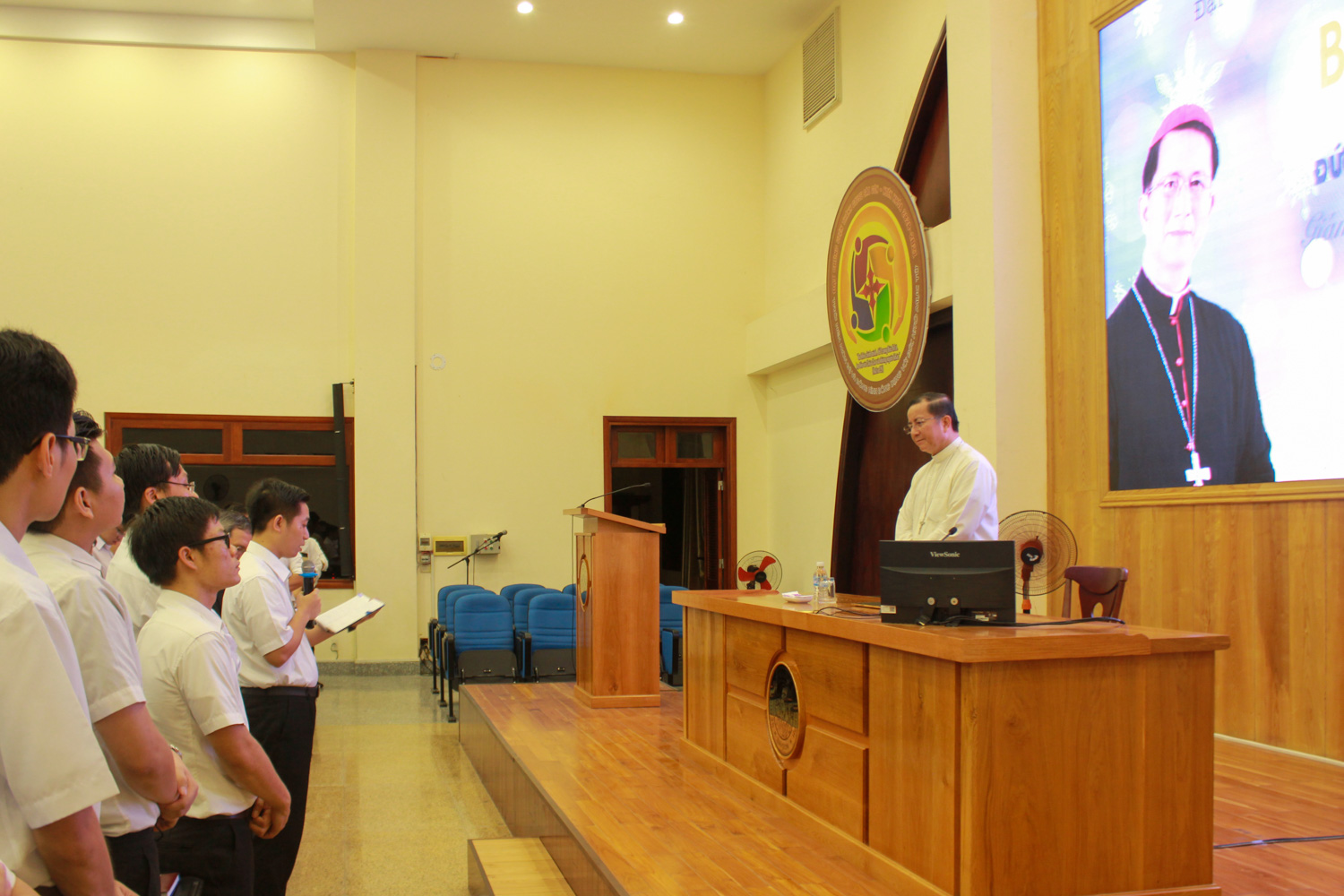 Đầu buổi huấn đức, cha Giuse Bùi Công Trác, giám đốc Đại Chủng viện, đại diện cho toàn thể quý cha và quý thầy, ngỏ lời tri ân đến Đức cha, dù rất bận rộn với công việc mục vụ trong những ngày Đại lễ Giáng Sinh đã gần kề, vẫn sắp xếp để đến với đoàn con cái tại Đại Chủng viện. Cha Giám đốc cũng xin Đức Cha cầu nguyện thêm cho quý cha và quý thầy luôn cố gắng chu toàn bổn phận và trách nhiệm mà quý Đức cha đã tín nhiệm giao phó.