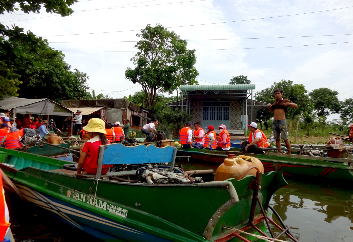 Đoàn tiếp tục phát quà đến các làng bè, vận chuyển bằng thuyền đến từng gia đình. Nhiều hộ là Việt Kiều Campuchia hồi hương, cuộc sống còn nhiều khó khăn khiến các thành viên đoàn xúc động. Mọi người dùng cơm trưa tại giáo điểm lúc 12g15.