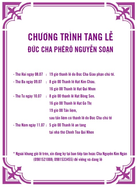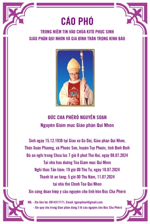 Trong niềm tin vào Chúa Kitô Phục Sinh, Giáo phận Qui Nhơn và gia đình trân trọng kính báo: Đức cha Phêrô Nguyễn Soạn, nguyên Giám mục Giáo phận Qui Nhơn, sinh ngày 15-12-1936 đã an nghỉ trong Chúa lúc 7g08 thứ Hai 8-7-2024. Thánh lễ an táng lúc 5g thứ Năm 11.7.2024.